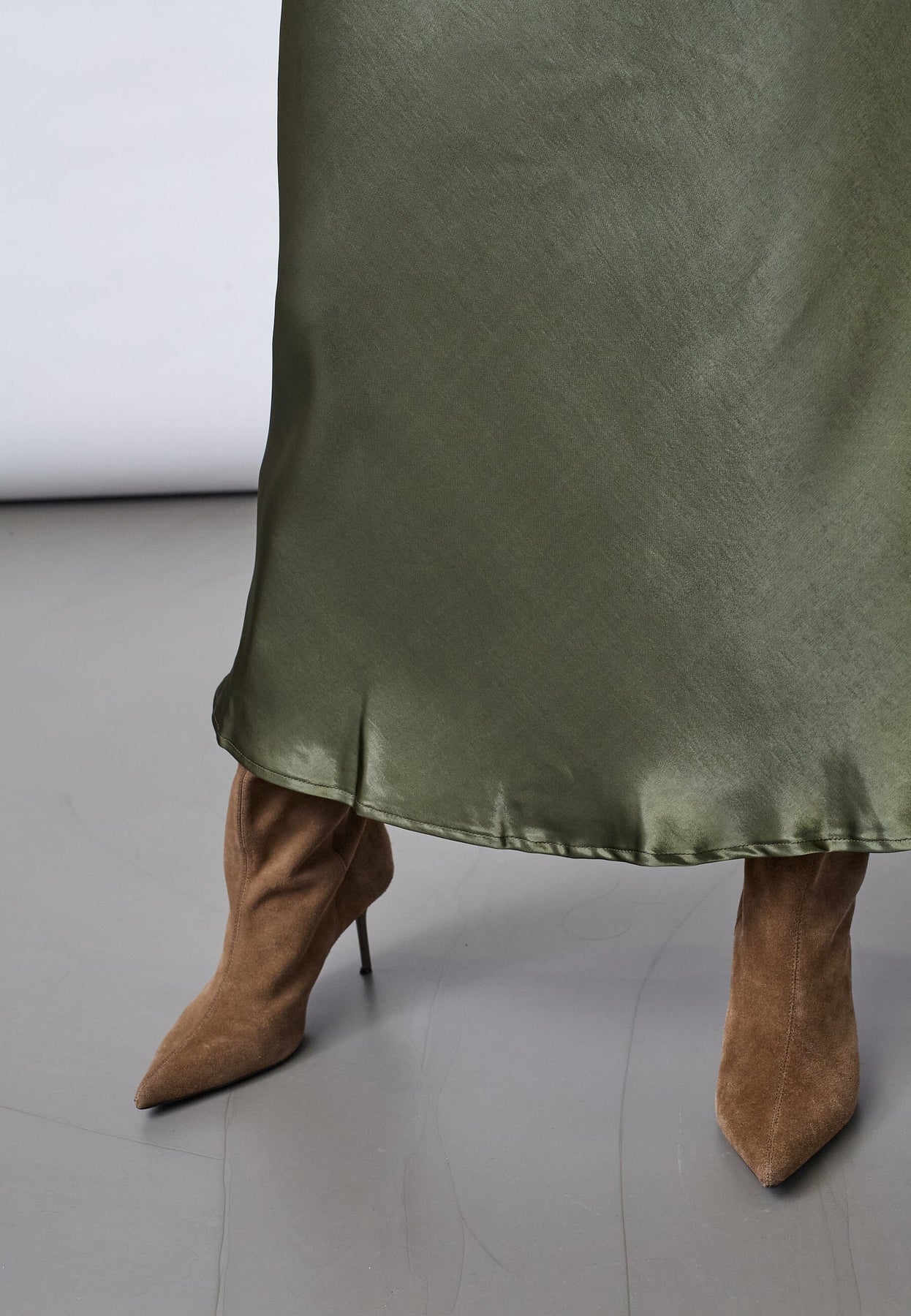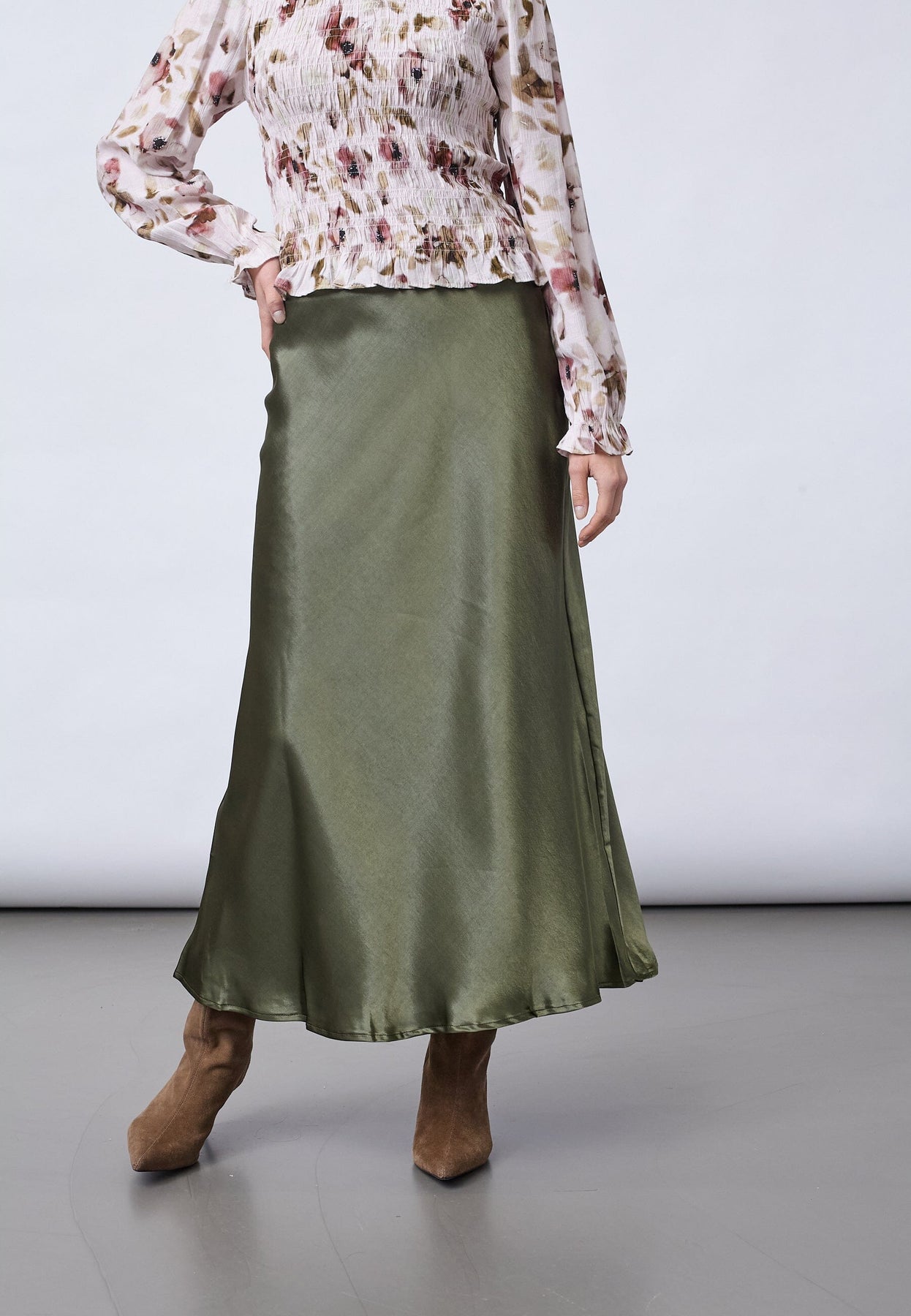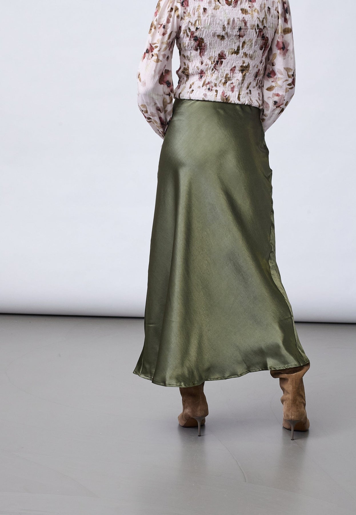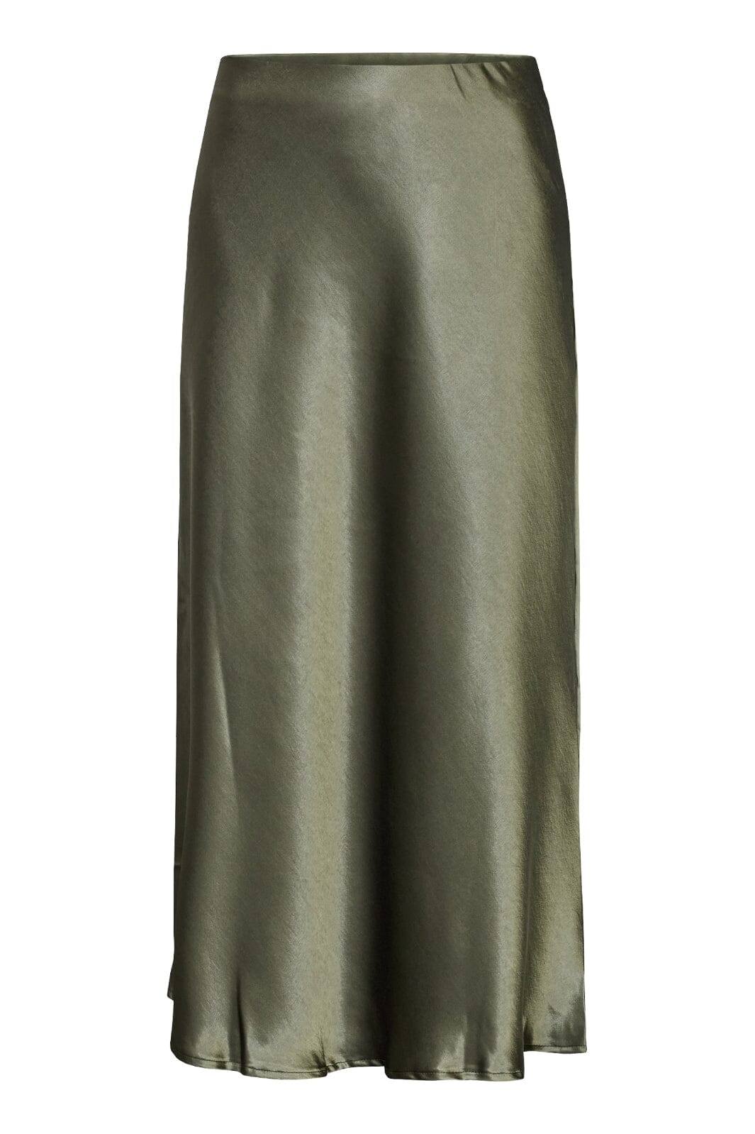Rok van Sisters Point, gemaakt van satijn in een olijfgroene tint. De rok heeft een A-lijnmodel en een lengte tot halverwege de kuit.