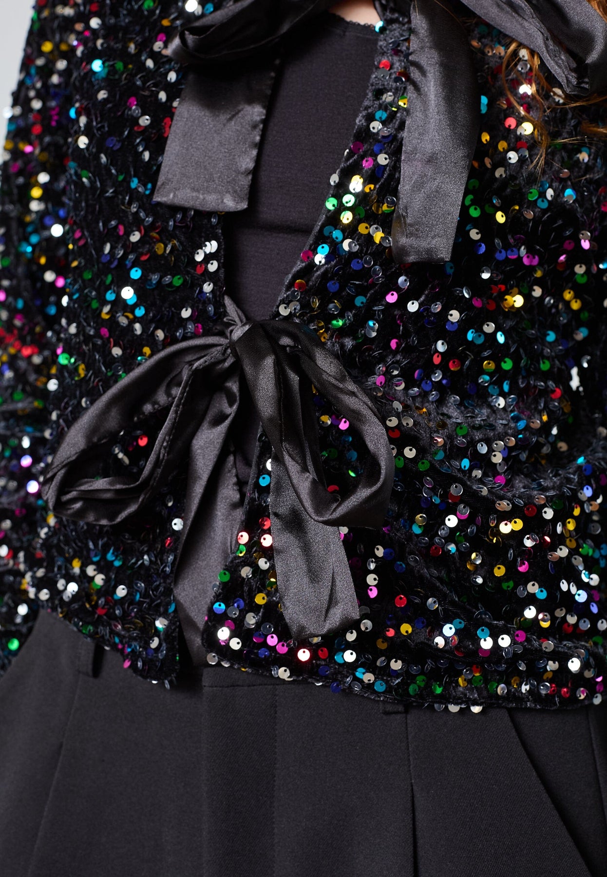 Zwarte top van Sisters Point met gekleurde pailletten overal. Twee grote strikken van gladde stof sieren de voorkant, en de top heeft lange mouwen met dezelfde paillettenafwerking.