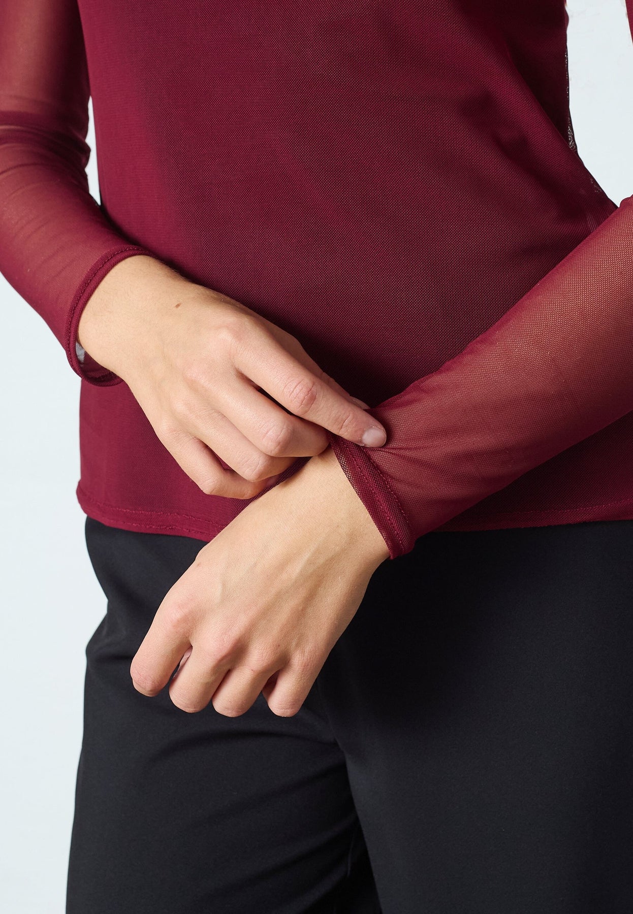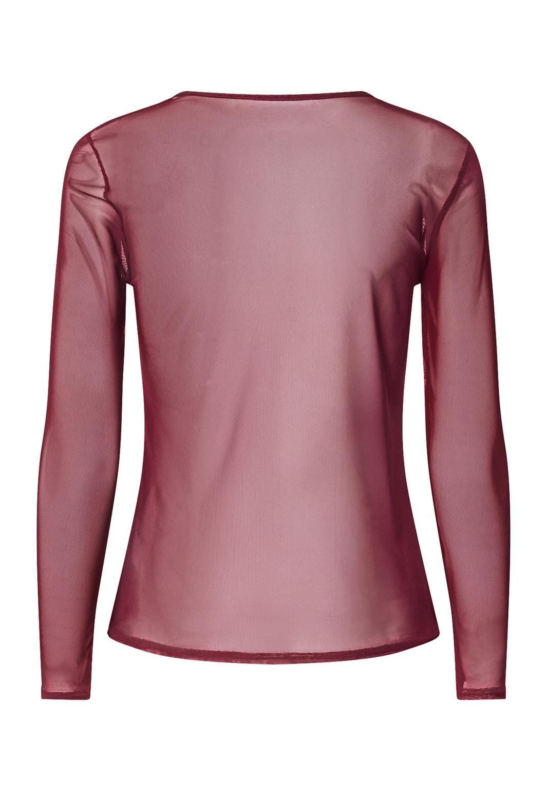 Een bordeauxrode blouse van Sisters Point, gemaakt van transparant mesh. De blouse heeft lange mouwen en een boothals met slim fit.
