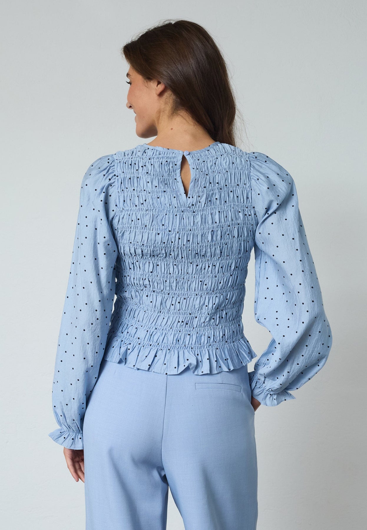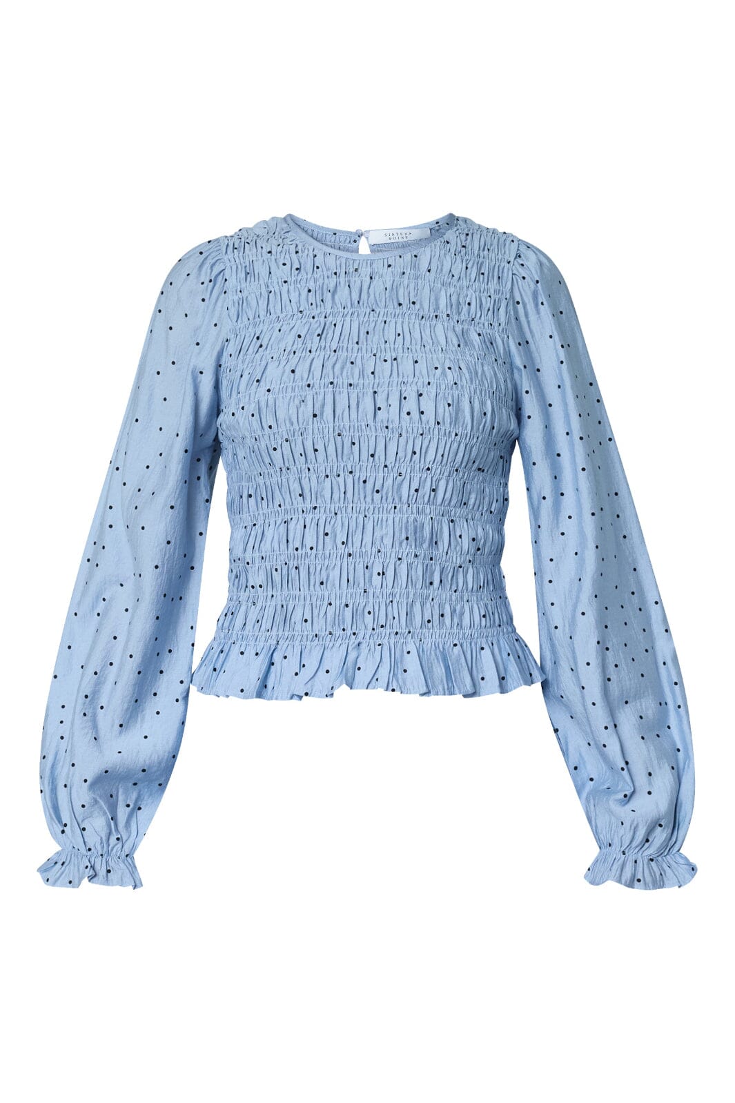 Lichtblauwe blouse van Sisters Point met zwarte stippen. De blouse is geschikt voor zowel casual als feestelijke gelegenheden.