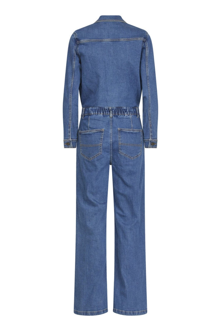 Blauwe jumpsuit van grove denim van Sisters Point. Hij heeft een overhemdkraag, knoopsluiting aan de voorkant en een taille-naden. De borstzak en de decoratieve stiksels geven een klassieke uitstraling.