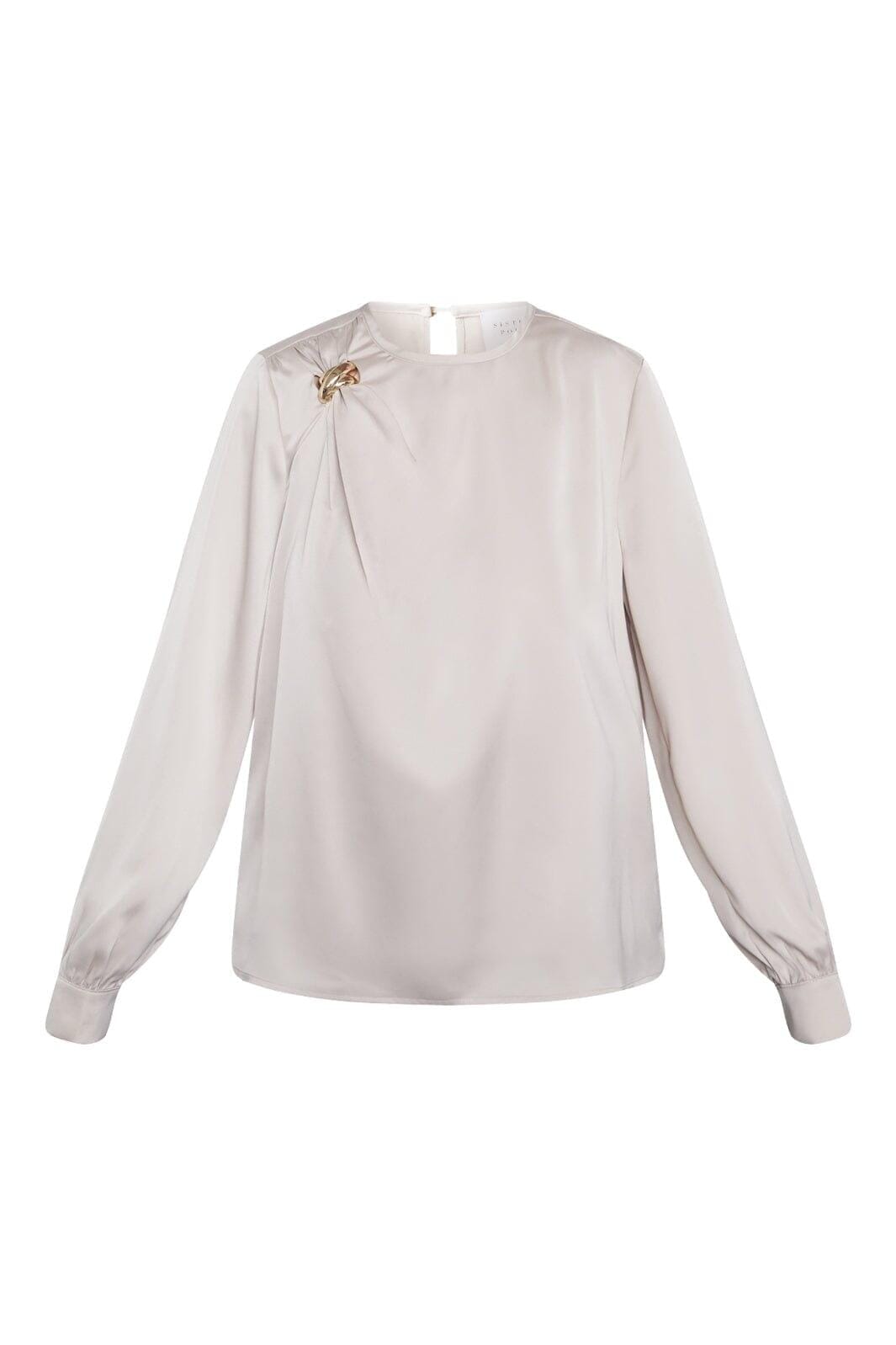 Een licht crèmekleurige blouse van Sisters Point met lange mouwen en een goudkleurige metalen gesp op de schouder.