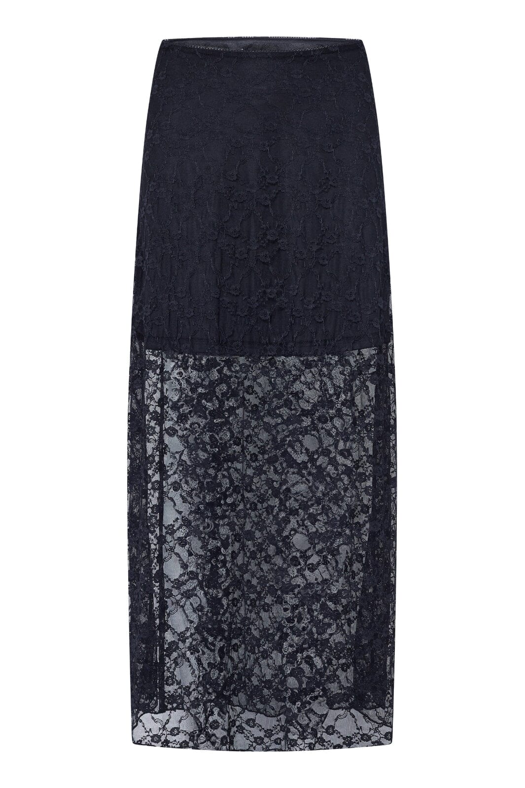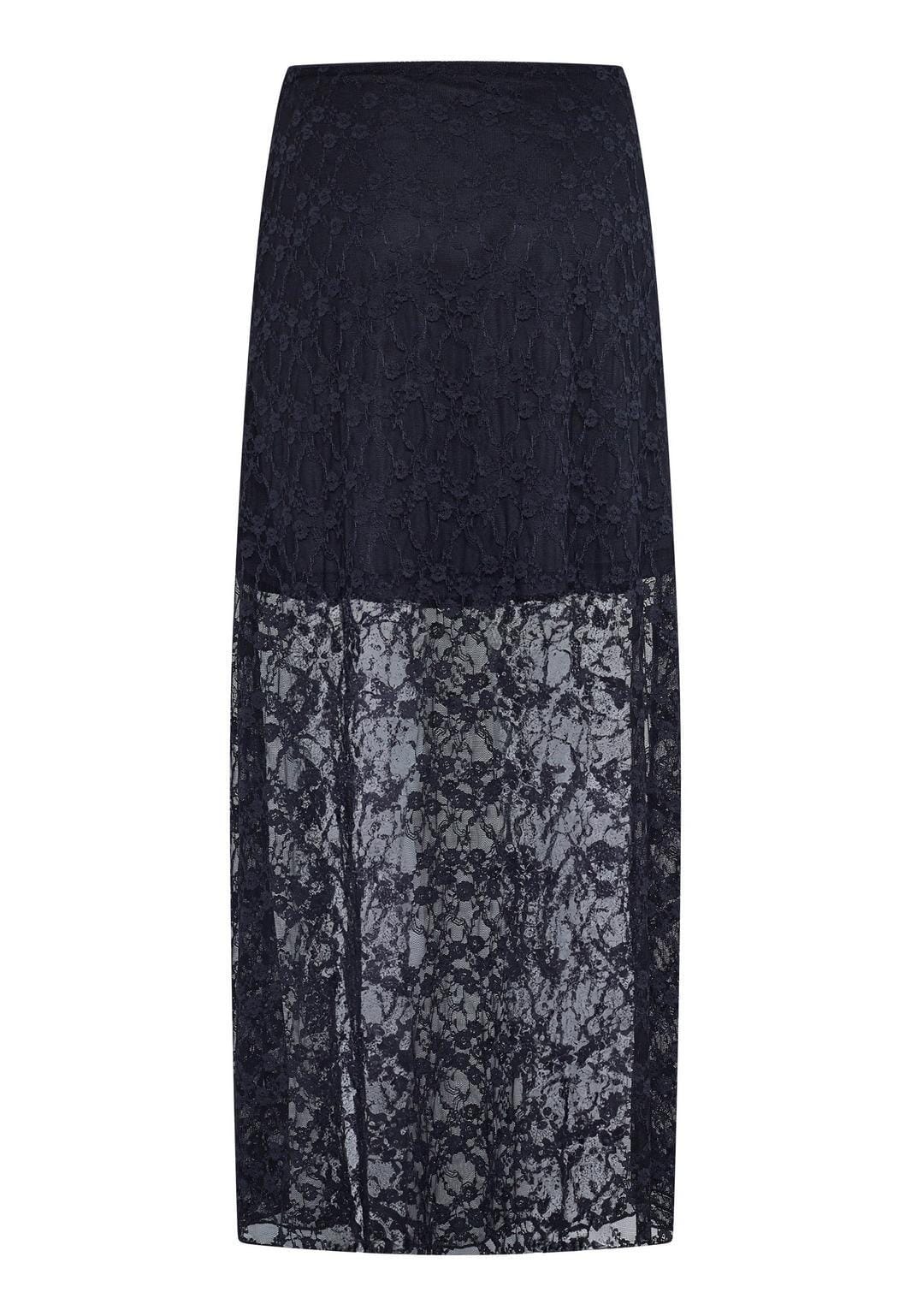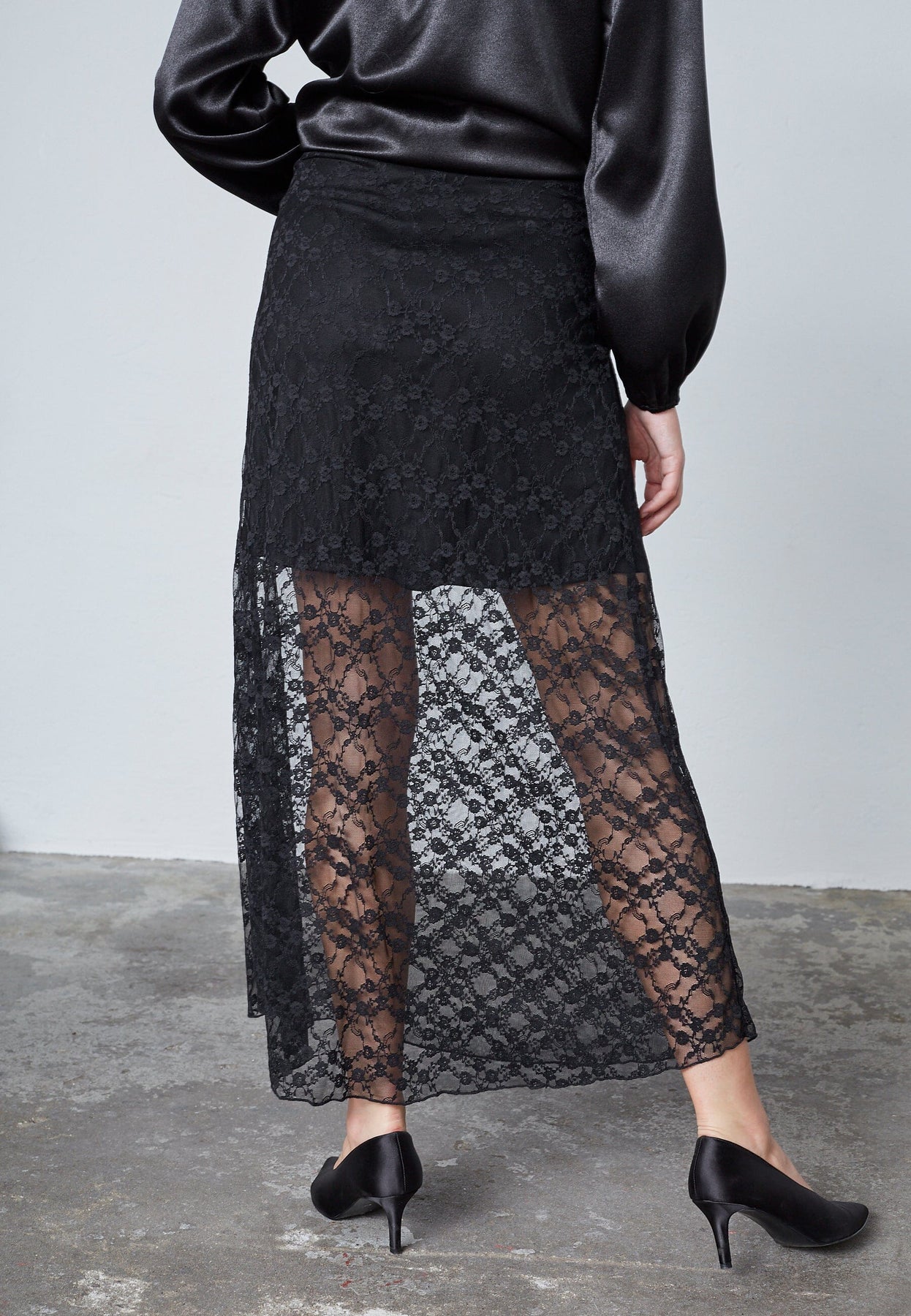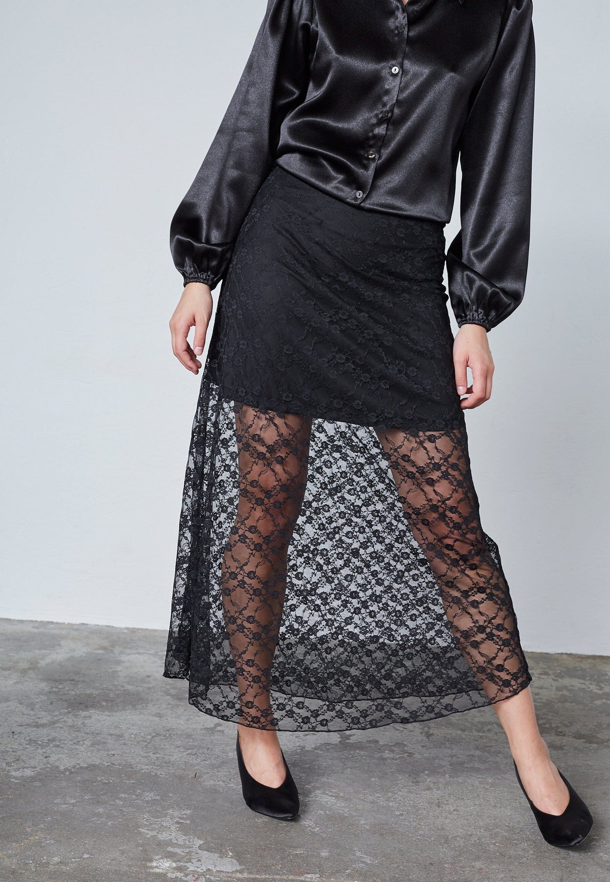 Zwarte rok van Sisters Point met bloemenkantpatroon. Het bovenste deel is aansluitend en ondoorzichtig, terwijl het onderste deel vanaf de knie een transparante kantlaag heeft.