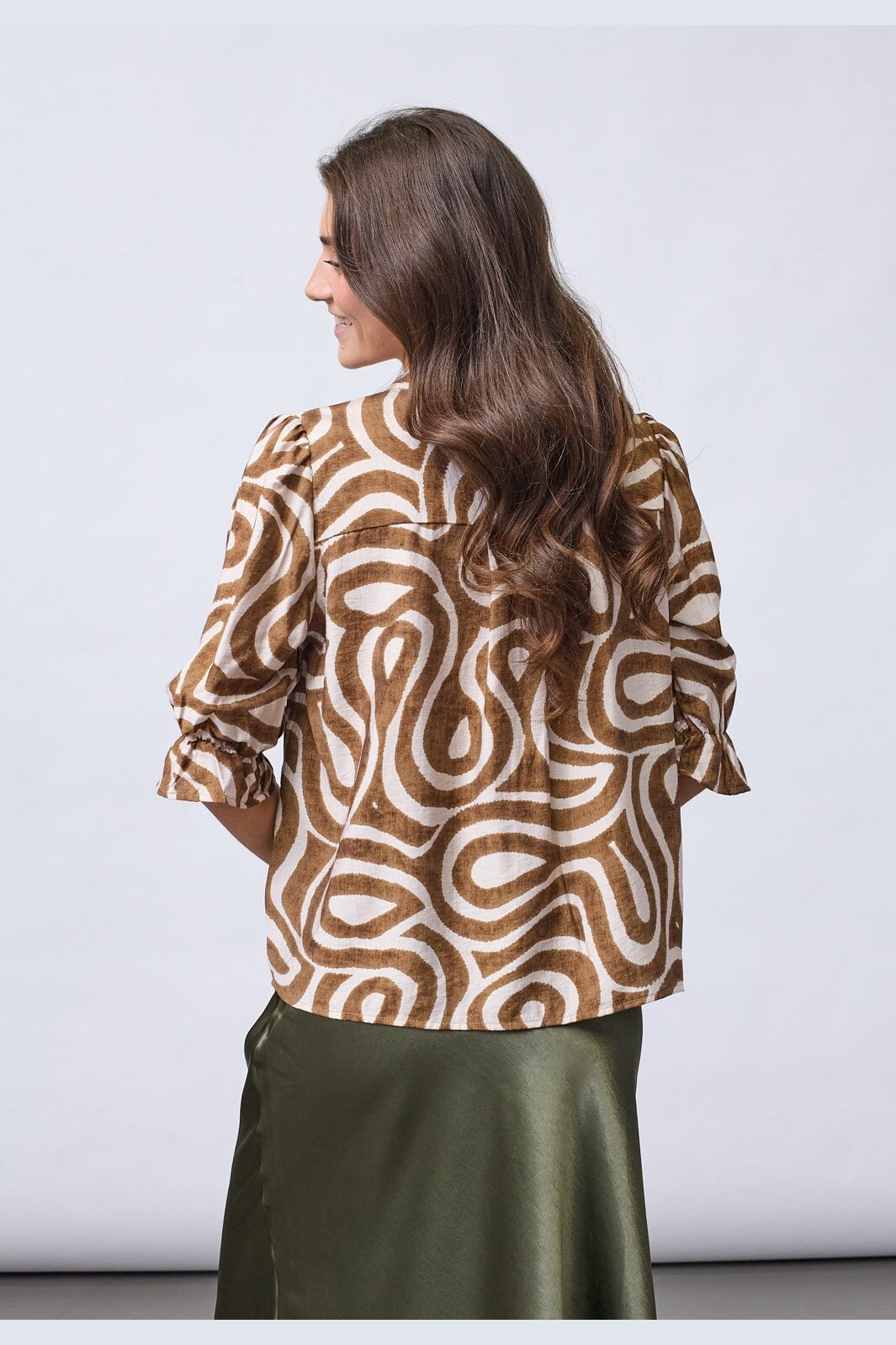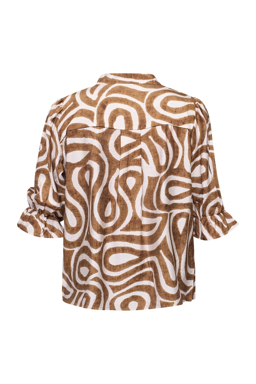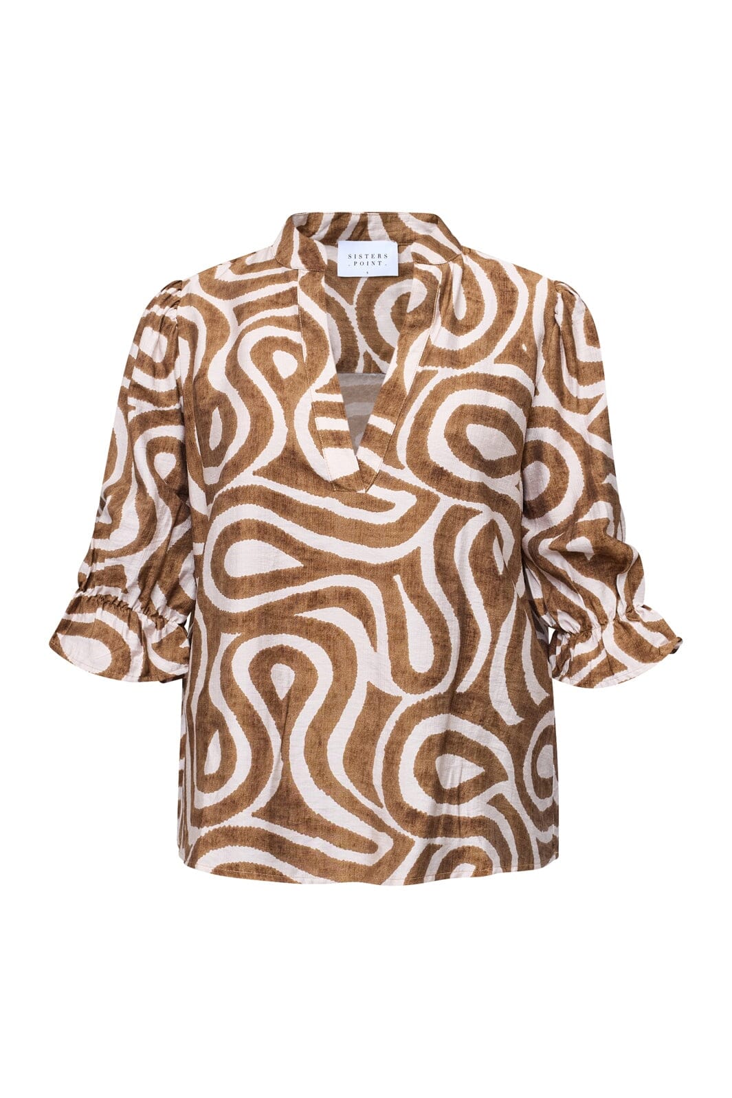 Blouse van Sisters Point met een bruin en beige etnisch wervelpatroon. De blouse heeft een V-hals met Chinese kraag en driekwartmouwen met ruches.