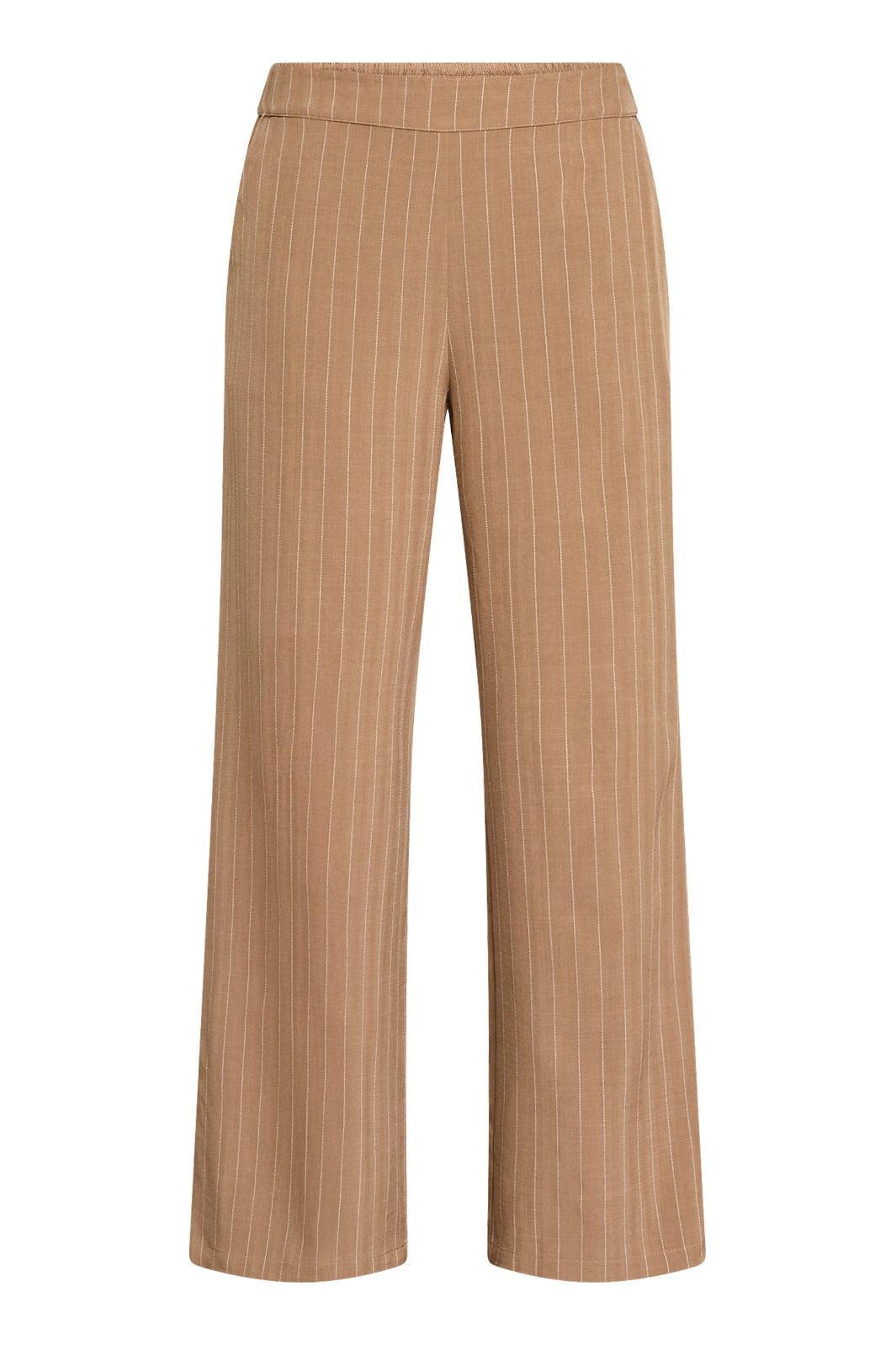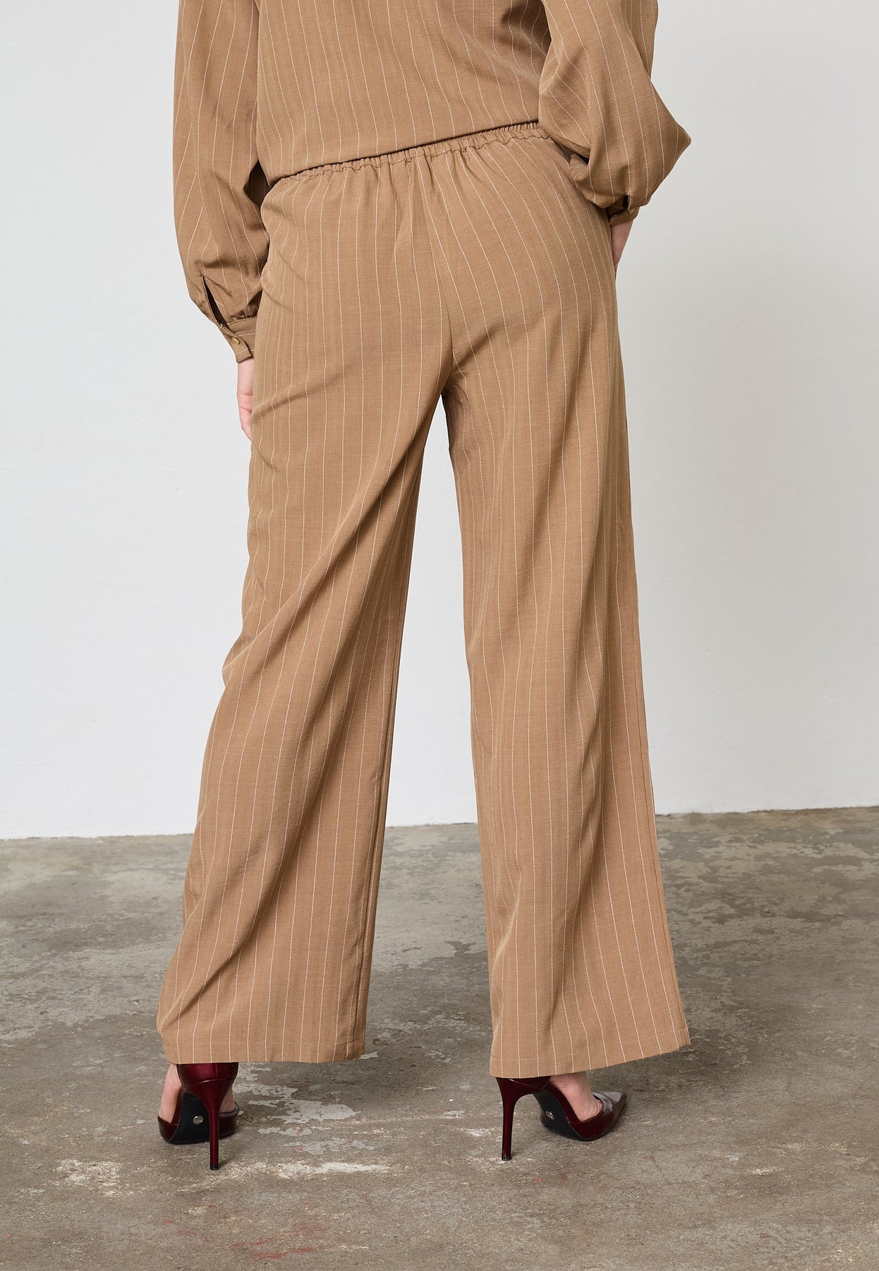 Bruine broek met krijtstreep van Sisters Point met wijde pijpen en een hoge taille. De broek is geschikt voor feestjes, alledaags gebruik en formele gelegenheden.
