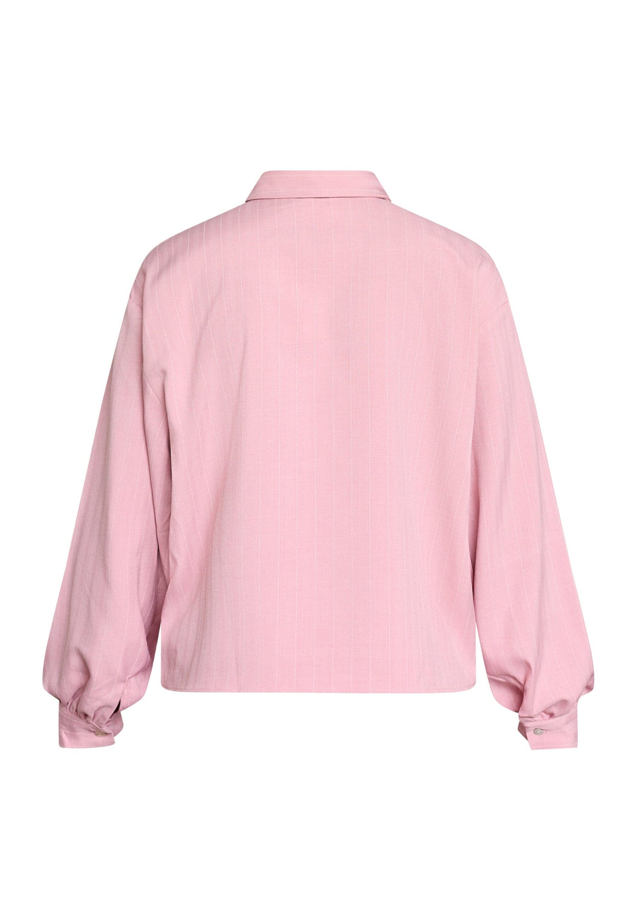 Roze blouse van Sisters Point met krijtstreep. De blouse heeft lange mouwen, een klassieke kraag en een losse pasvorm met borstzak en knoopsluiting.