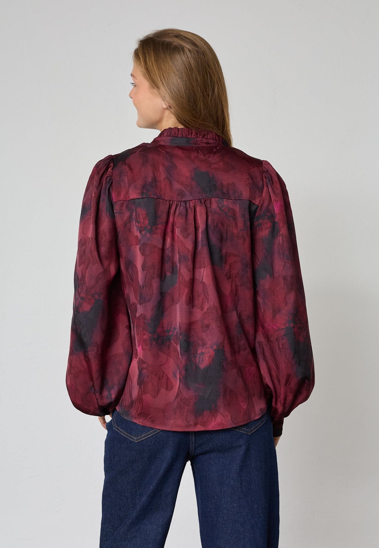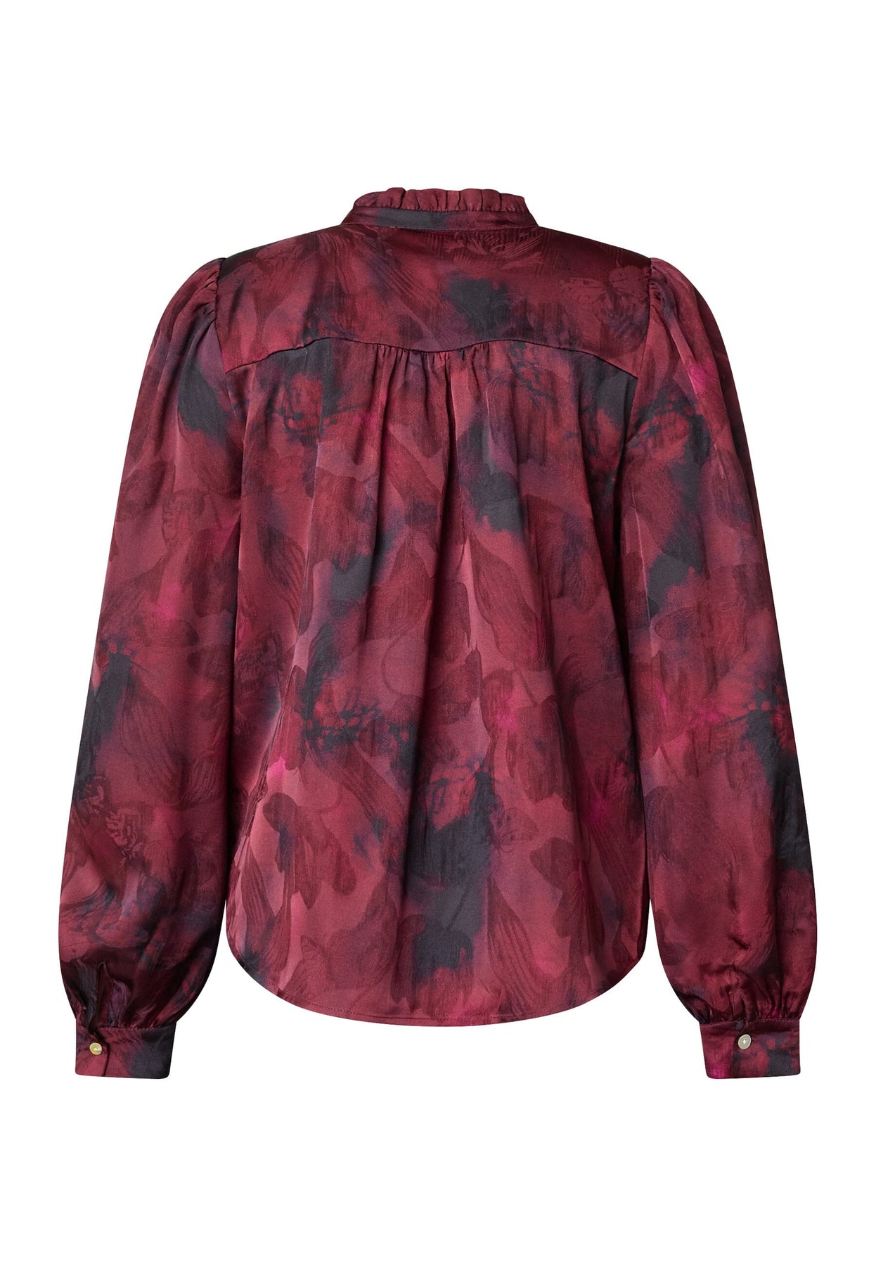 Blouse van Sisters Point in bordeaux met een vage bloemenprint. De blouse heeft een hoge hals met ruches en een knoopsluiting aan de voorkant met witte knopen.