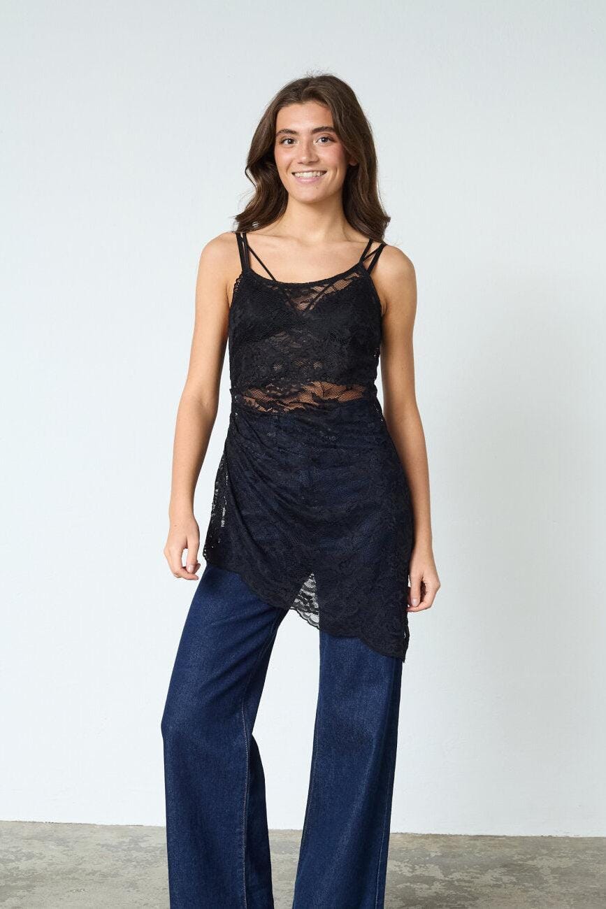 Zwarte kanten jurk van Sisters Point met bloemenpatroon. De jurk is doorzichtig en geschikt voor zowel ontspannen dagen als feestelijke gelegenheden.