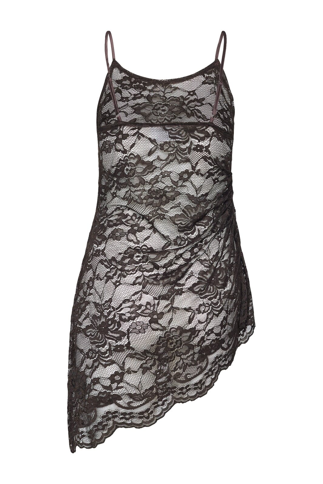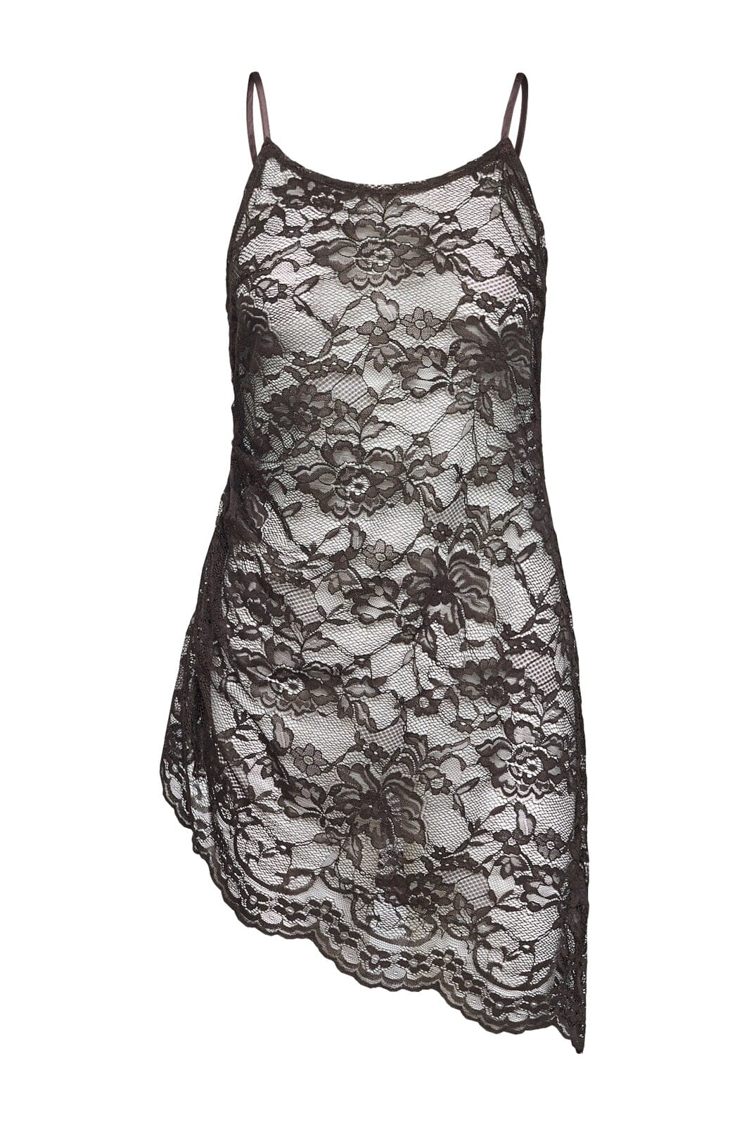 Blonde jurk van Sisters Point in een diepe bruine tint. De jurk is transparant en heeft een volledig bedekkend bloemenpatroon van kant.
