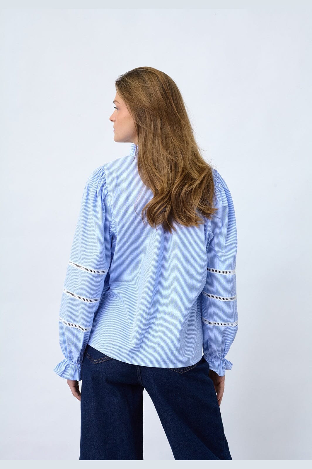 Blouse van Sisters Point in blauw en wit met strepen. De blouse is een pullover met een hoge halslijn en lange mouwen.