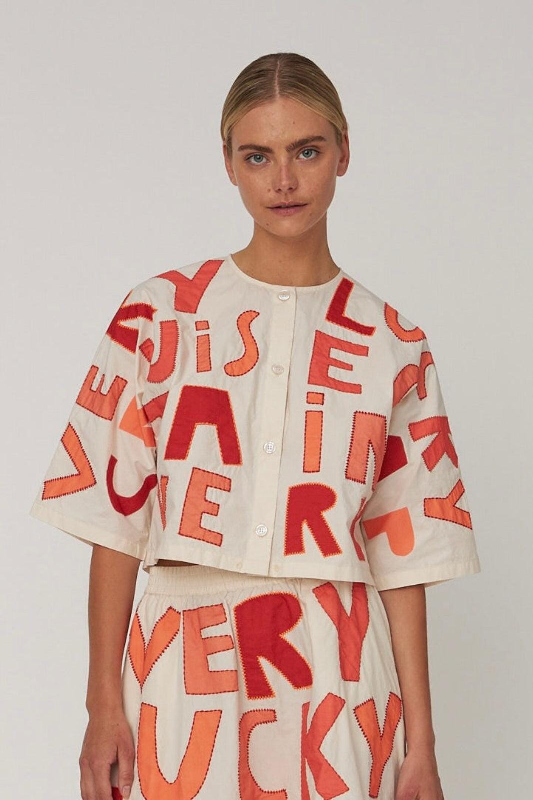 Overhemd van Stella Nova met een bedrukt patroon van grote letters in rode en oranje tinten op een lichte ondergrond. Het overhemd is gemaakt van biologisch katoen.