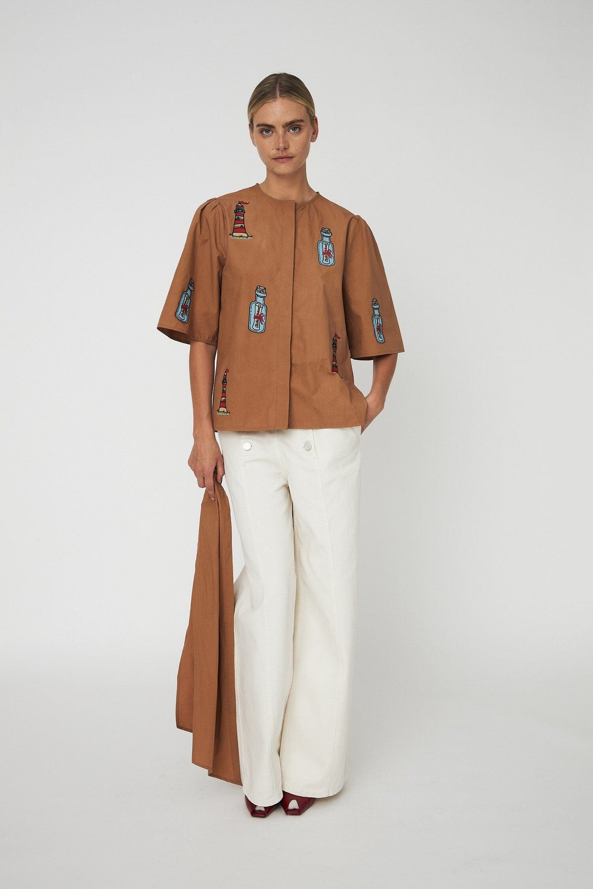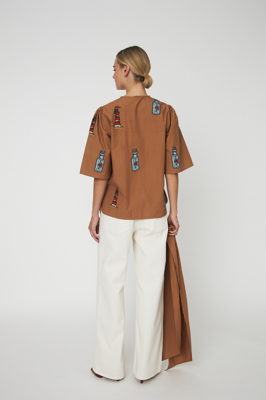 Bruin shirt van Stella Nova, gemaakt van 100% biologisch katoen. Het shirt heeft geborduurde motieven met vuurtorens en flessen en een grote strik bij de hals.