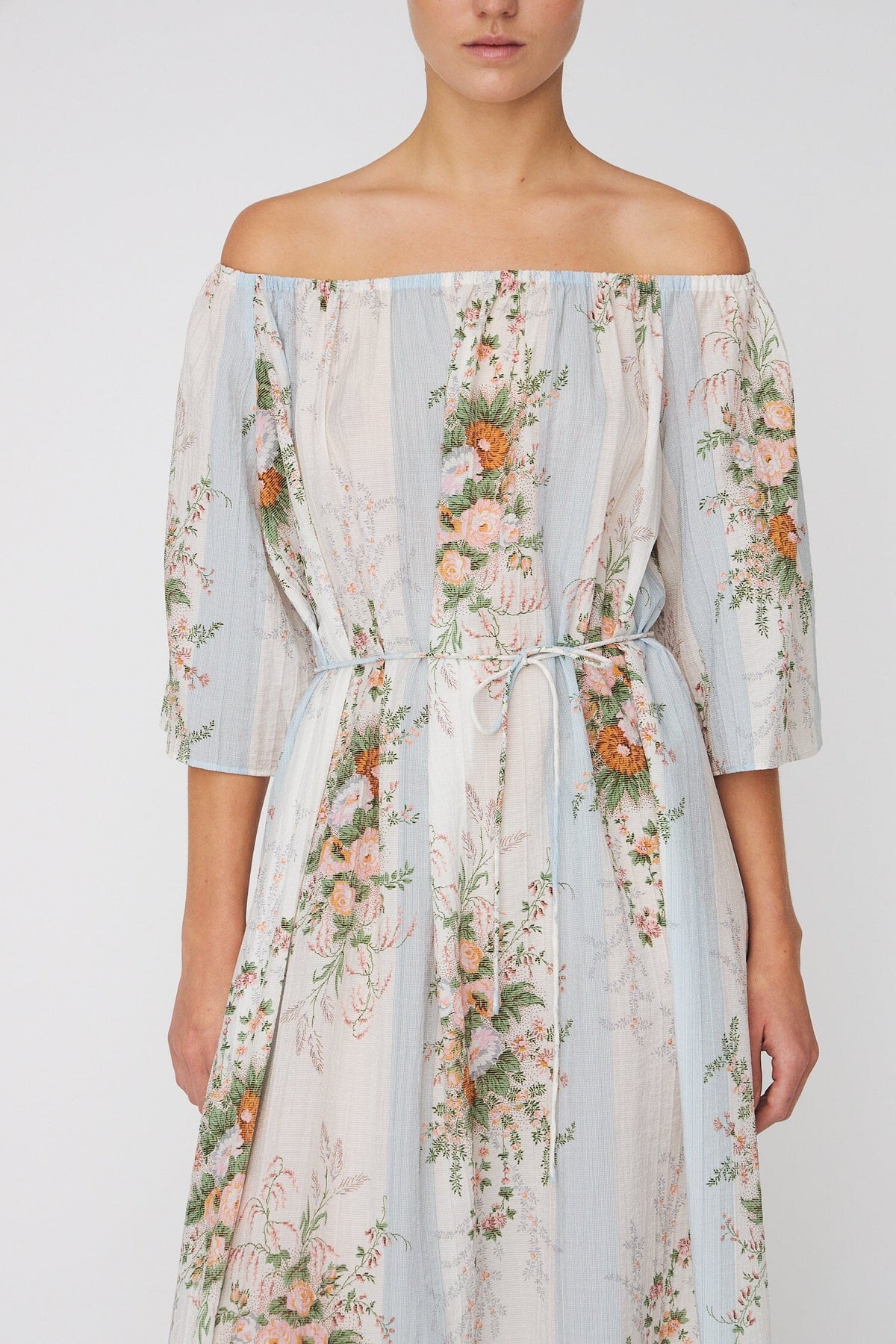 Maxijurk van Stella Nova met bloemenprint in crème, lichtblauw en wit. De jurk heeft een off-shoulder design met verlaagde schouders.