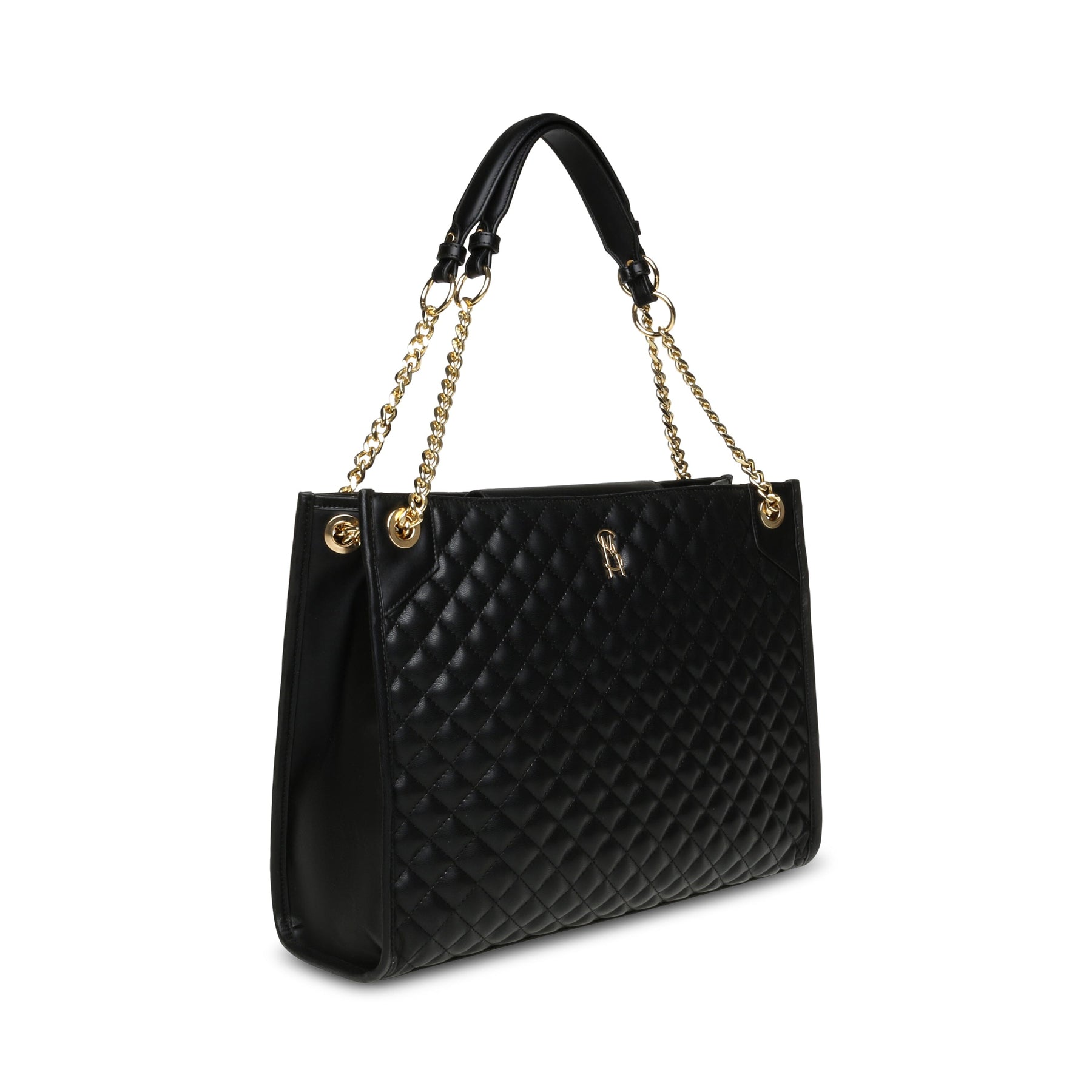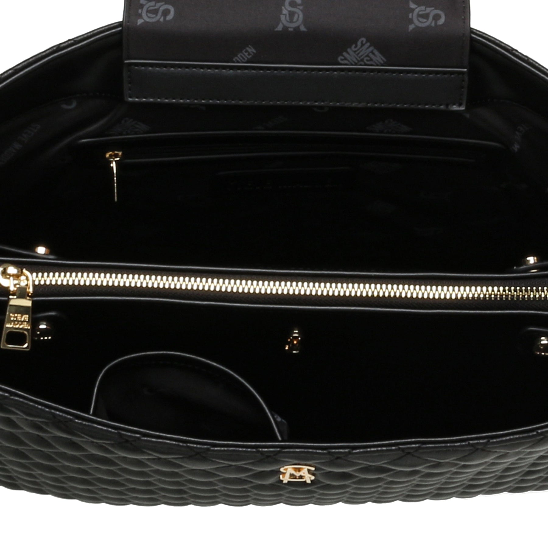 Zwarte shopper van Steve Madden met gewatteerd ontwerp en gouden details. De tas heeft zowel een kettingriem als handvatten en meerdere binnenvakken voor organisatie.