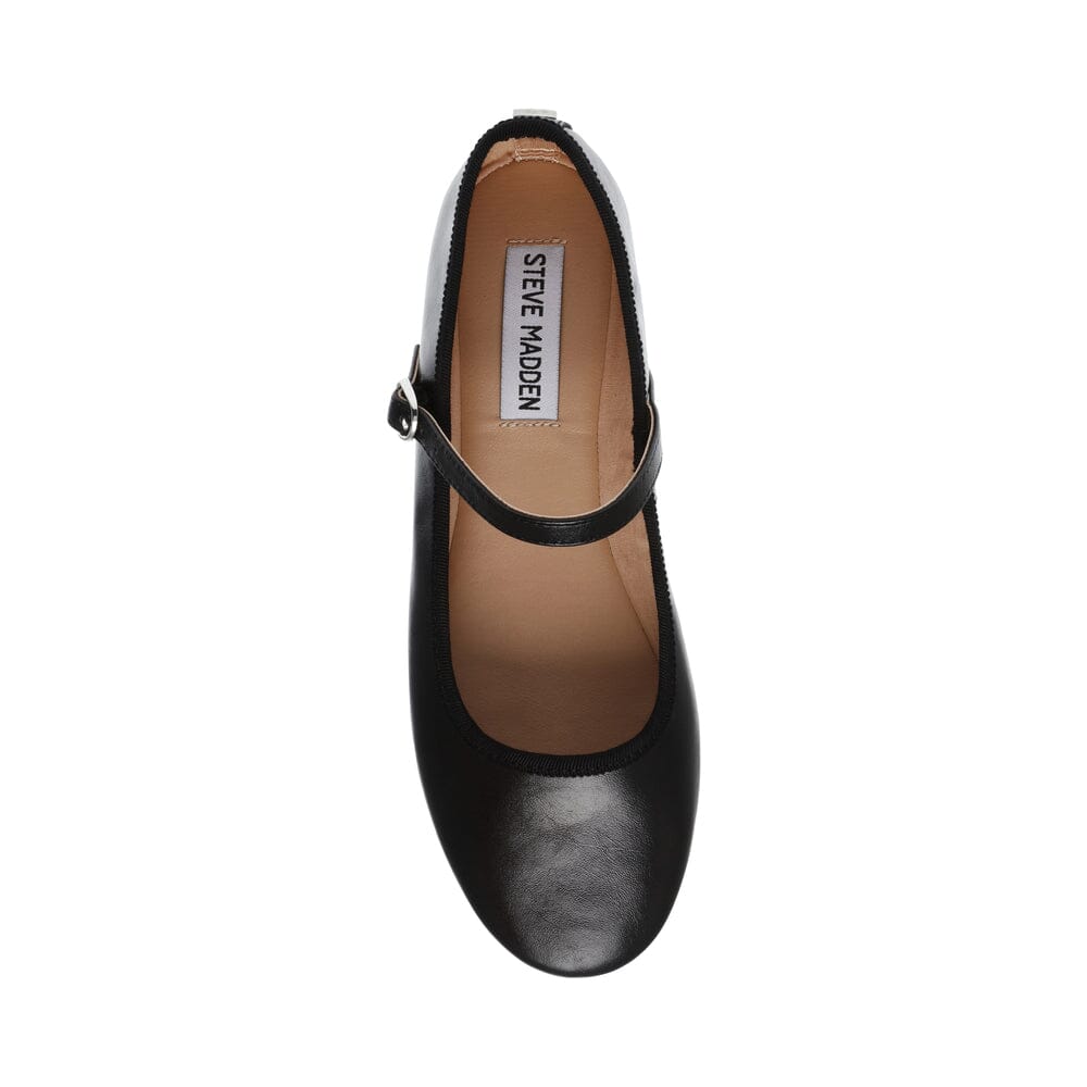 Zwarte ballerina van Steve Madden in leer met spitse neus en enkelband. De schoen heeft een strak ontwerp met focus op comfort en bruikbaarheid voor zowel dagelijks gebruik als feesten.