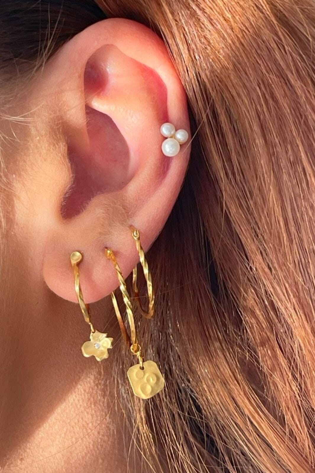 Goudkleurige creolen van Stine A met gedraaid ontwerp en gesmeed hanger. Het gedraaide patroon loopt helemaal rond de creool, terwijl de gesmede hanger de oorbel een unieke uitstraling geeft.