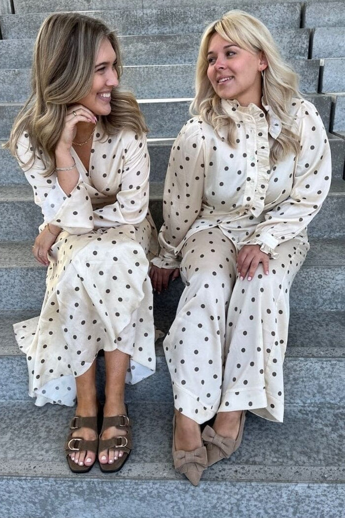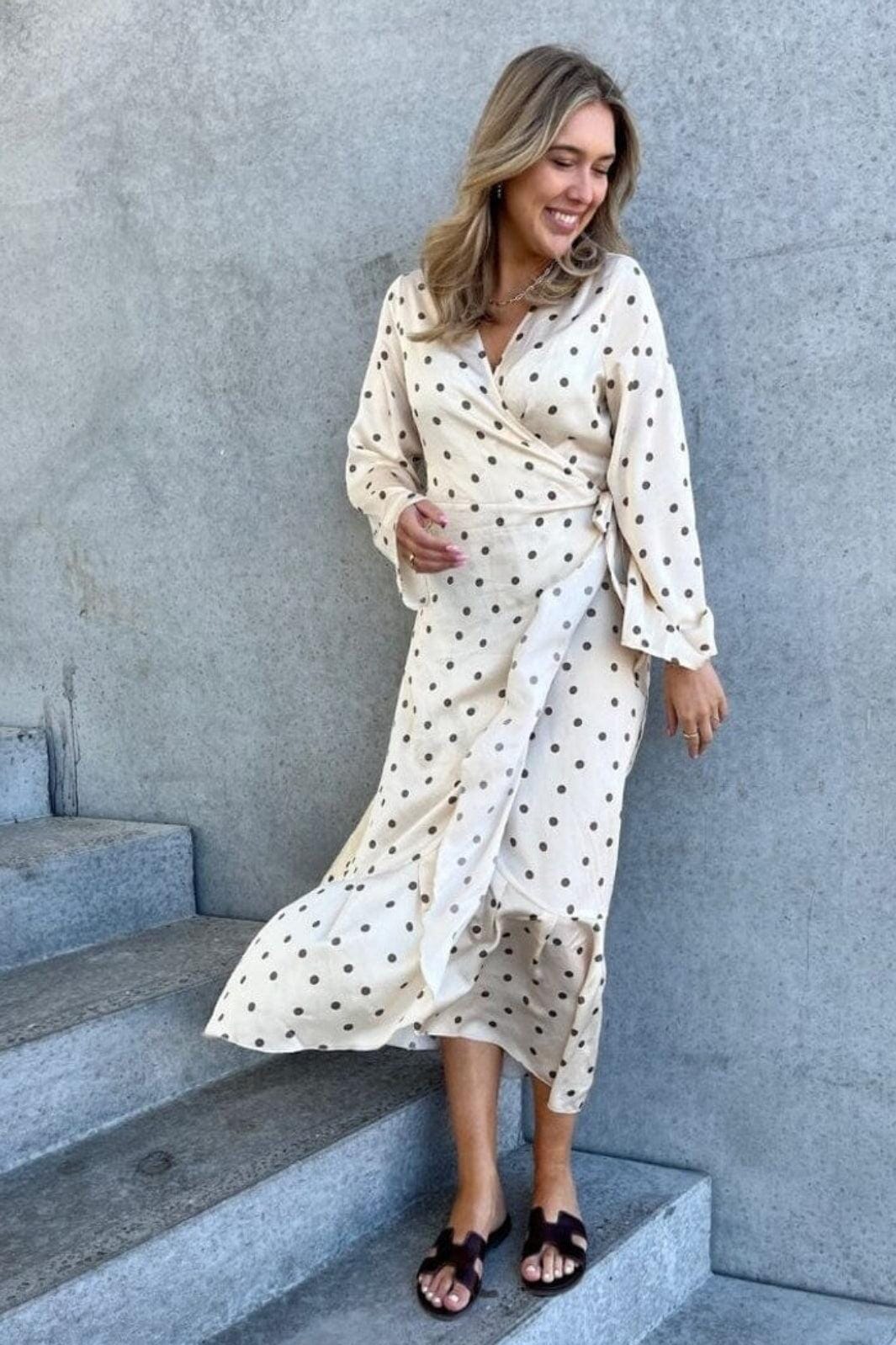Jurk van Stories From The Atelier By Copenhagen Shoes in offwhite met bruine stippen. De jurk heeft lange mouwen en een V-hals met wikkel-effect.