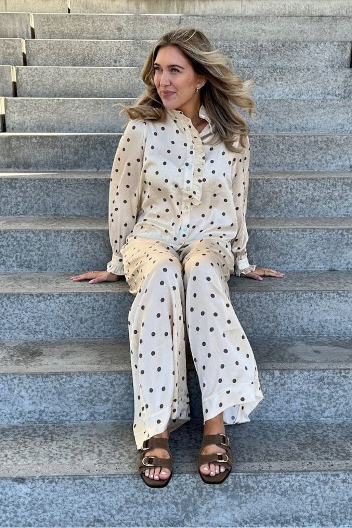 Een offwhite blouse met bruine stippen van Stories From The Atelier by Copenhagen Shoes. De blouse heeft ruches bij de kraag en een knoopsluiting aan de voorkant.