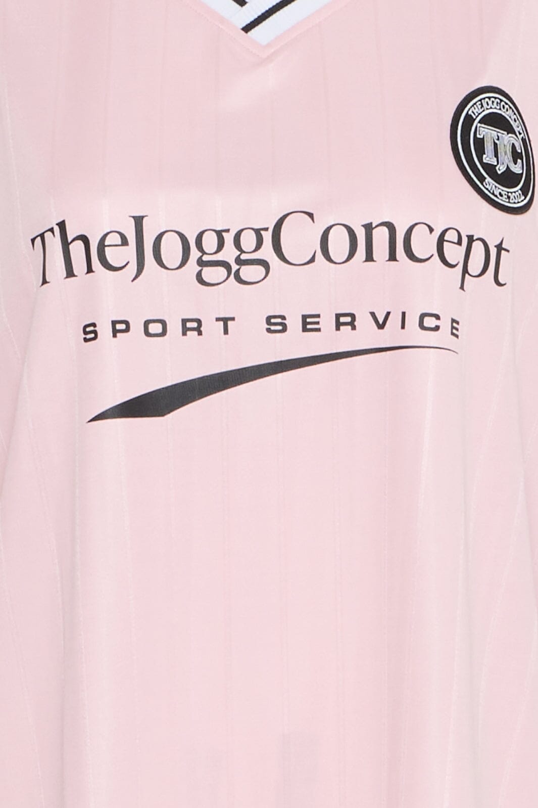 Roze t-shirt van The Jogg Concept met polokraag en V-hals. Het heeft een losse pasvorm en is gemaakt van gerecycled polyester met logoprint op de borst.
