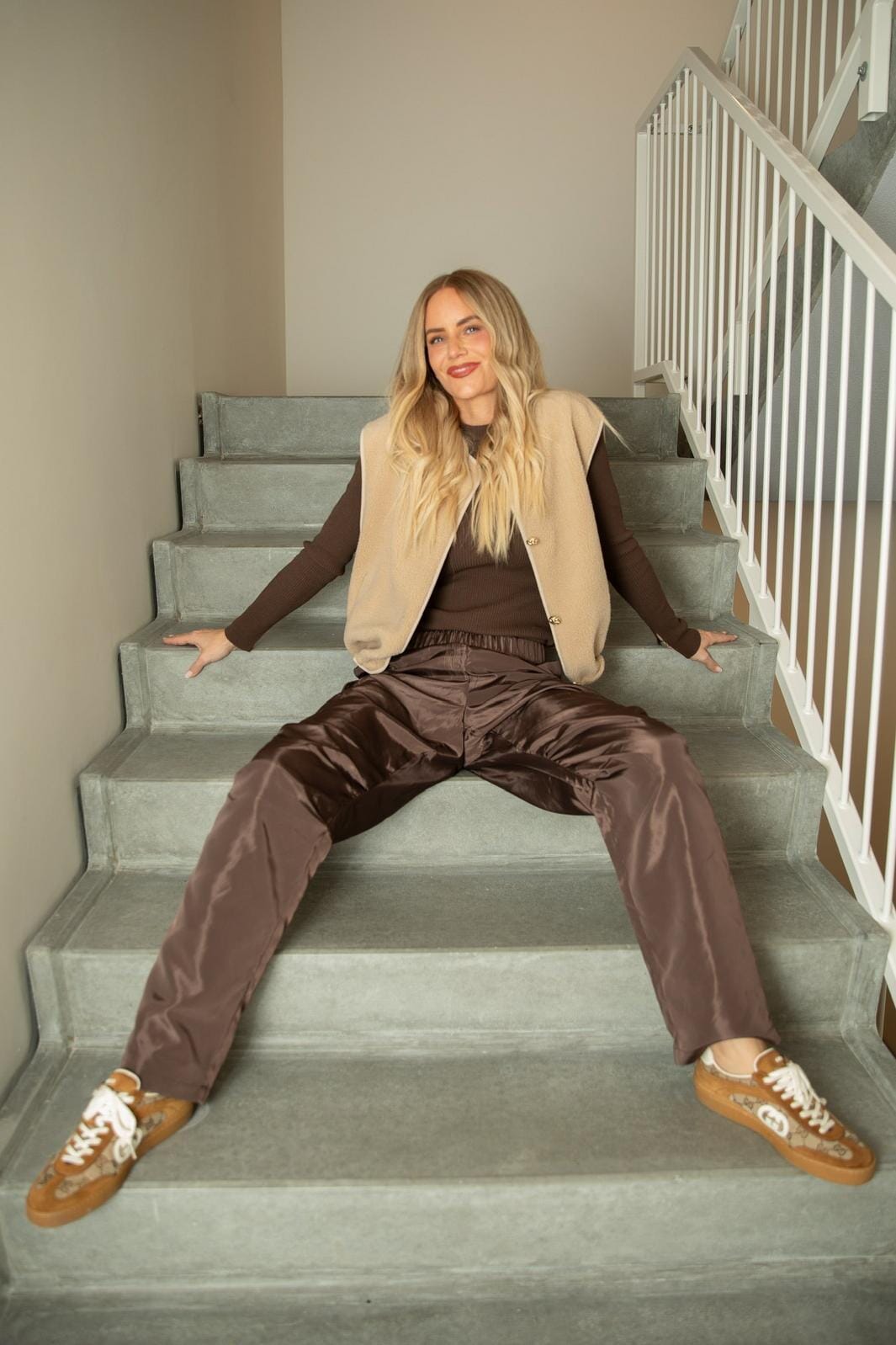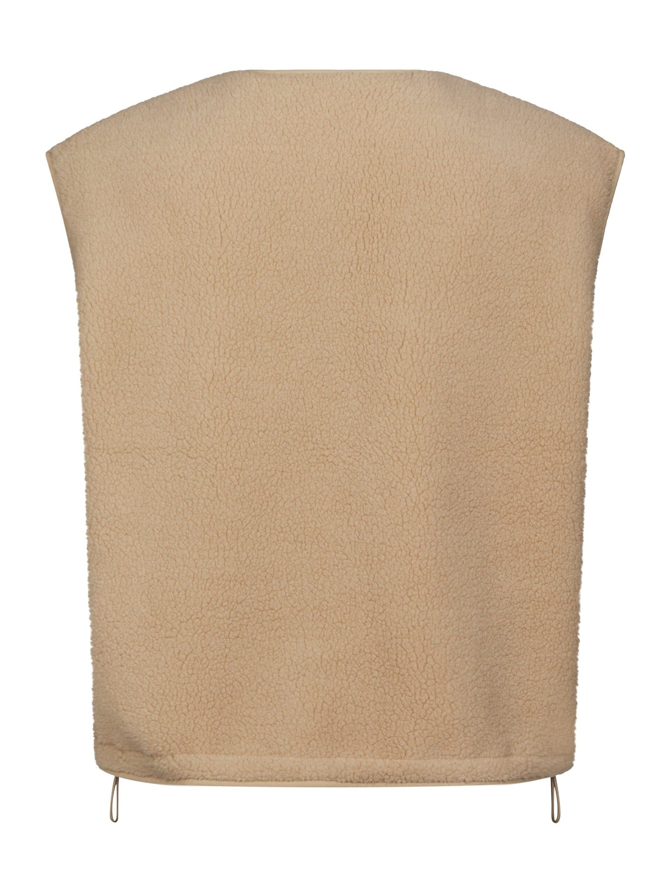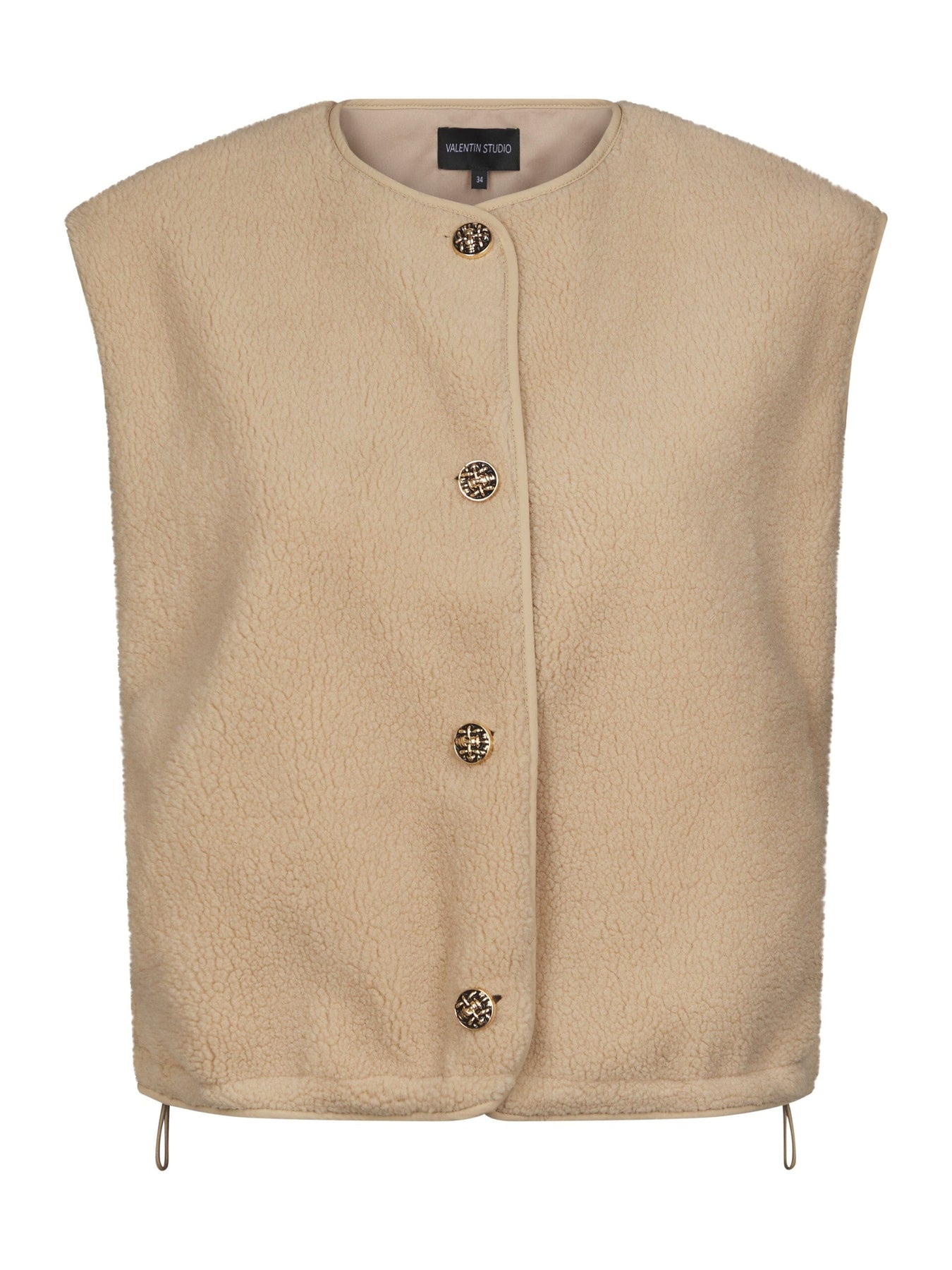 Zandkleurig fluffy vest van Valentin Studio. Het heeft een knoopsluiting aan de voorkant en een mouwloos design met een ronde halslijn.