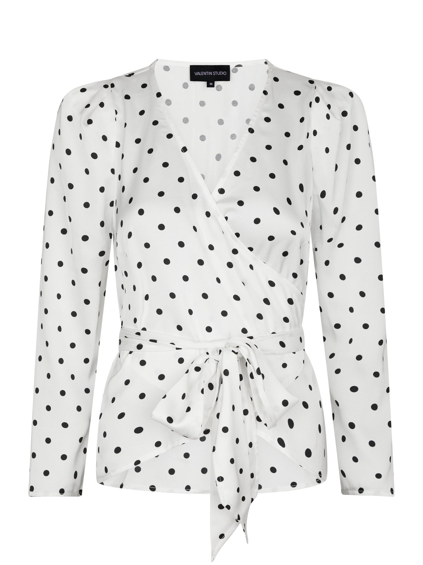 Witte blouse van Valentin Studio met zwarte stippen. De blouse heeft lange mouwen, een V-hals en een striklint aan de voorkant.