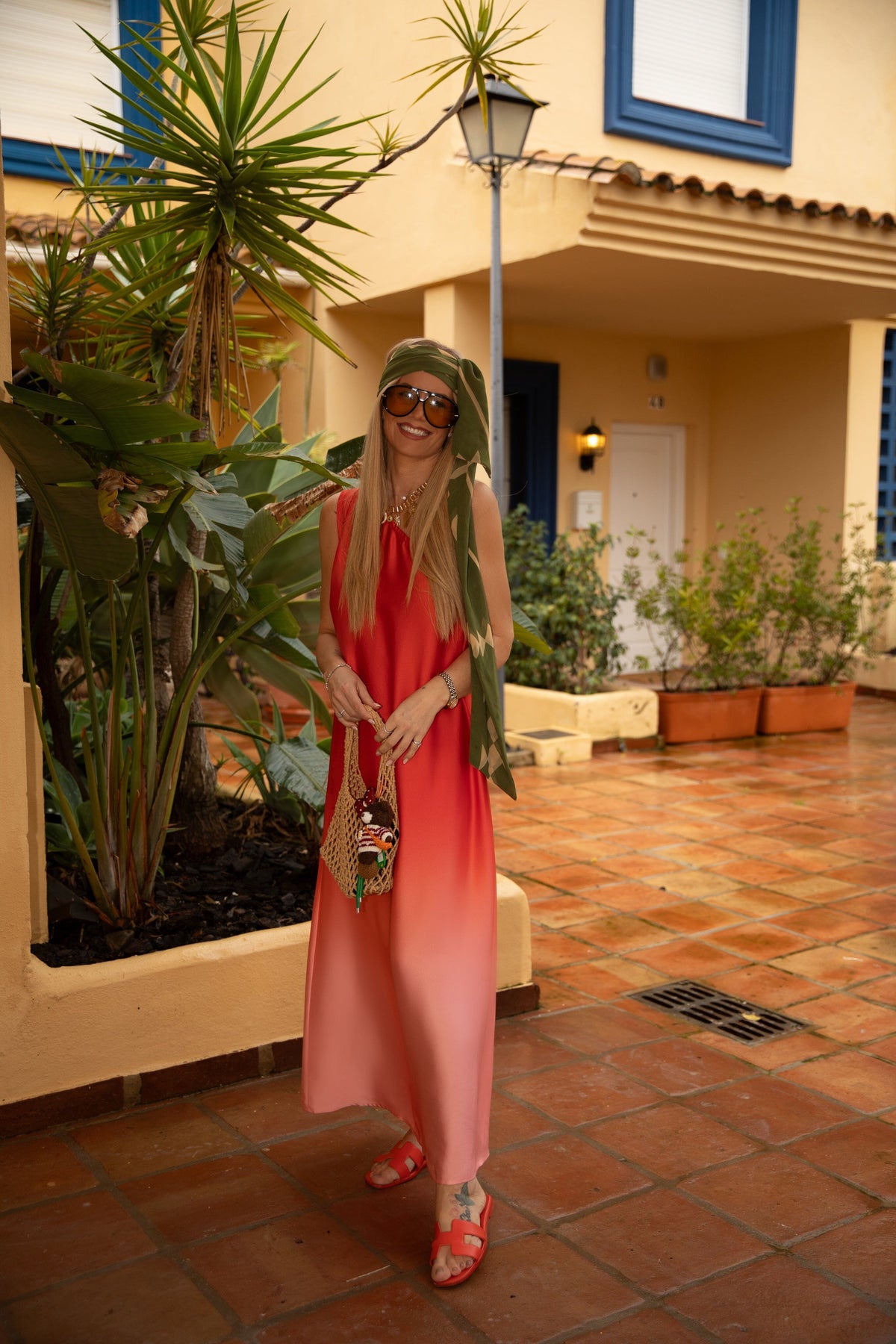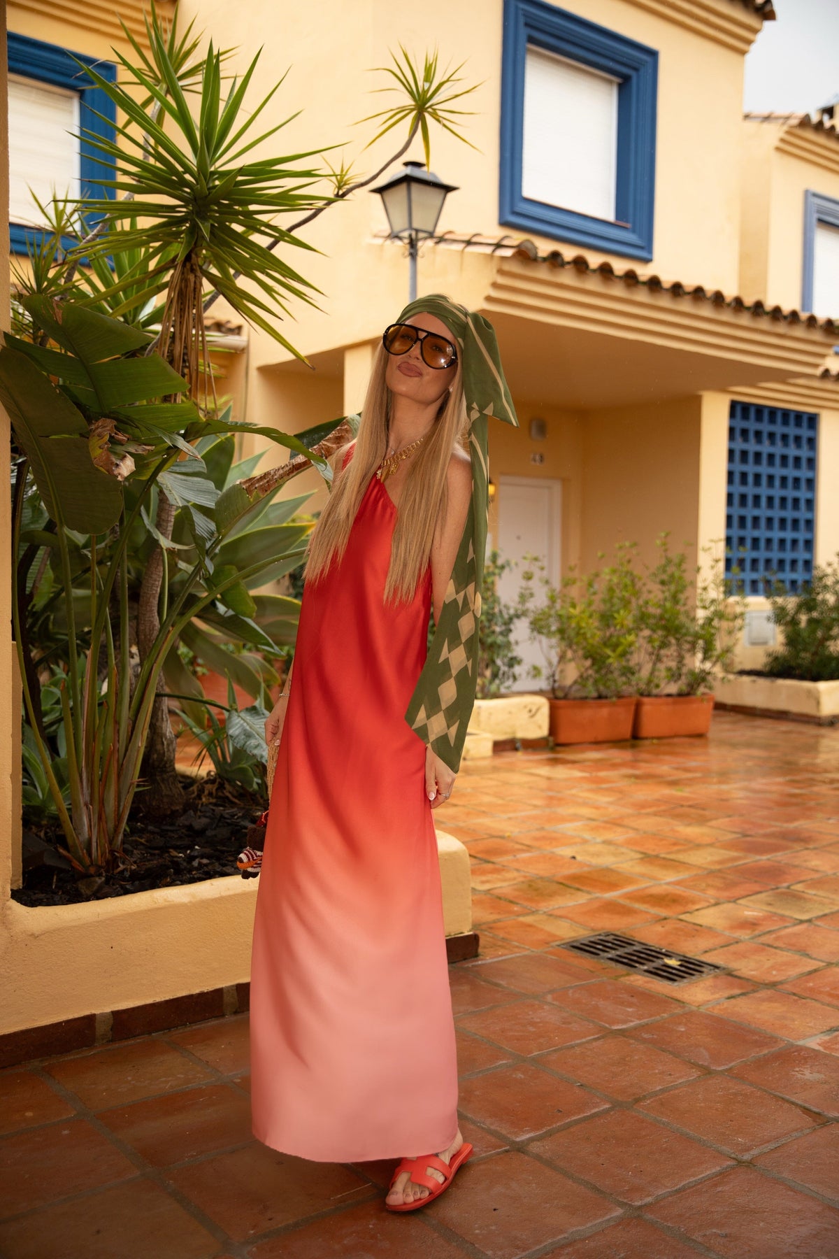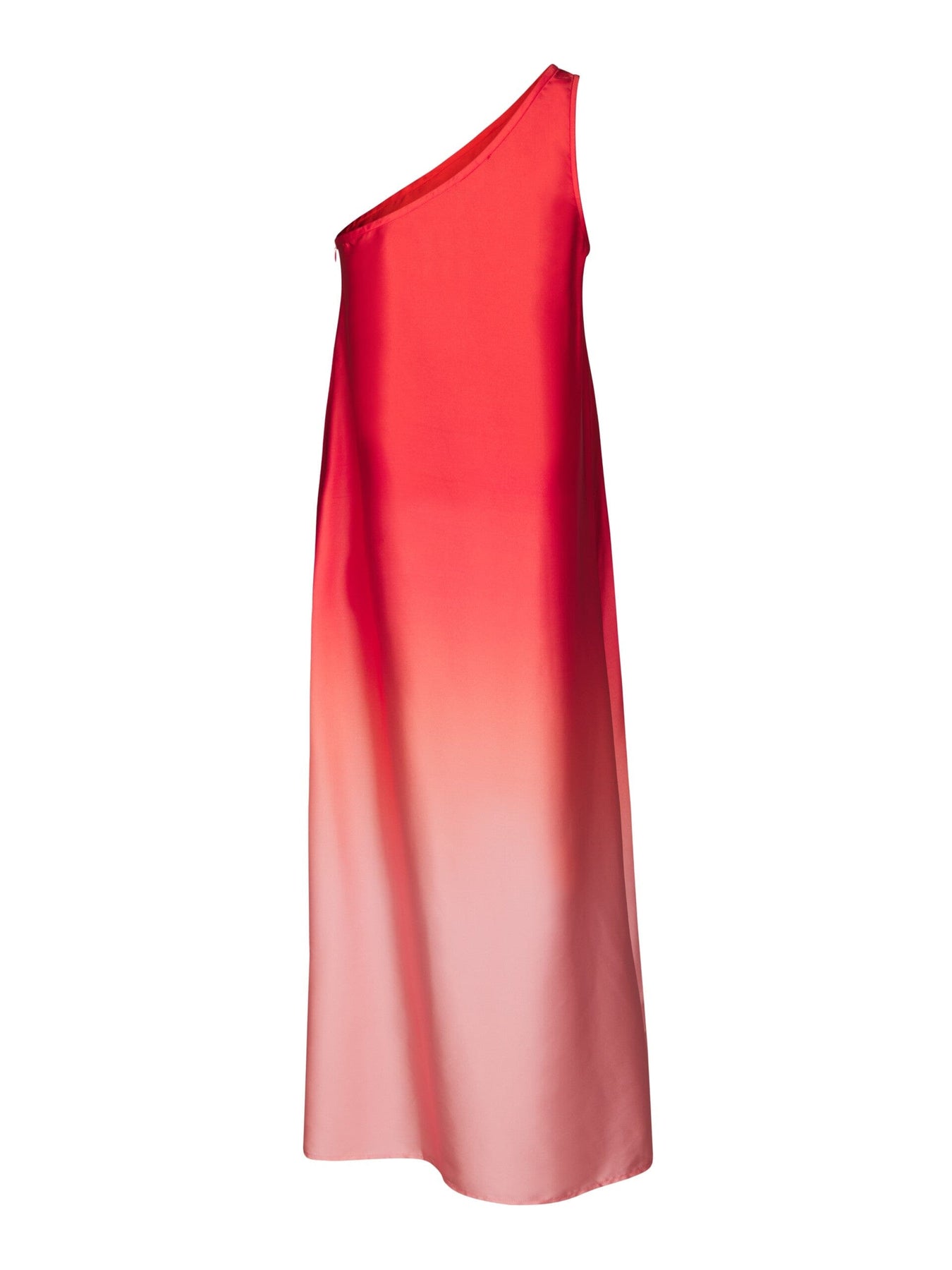 Rode jurk van Valentin Studio met ombre-kleurverloop en off-shoulder design. De jurk is enkellang en heeft een losse pasvorm.