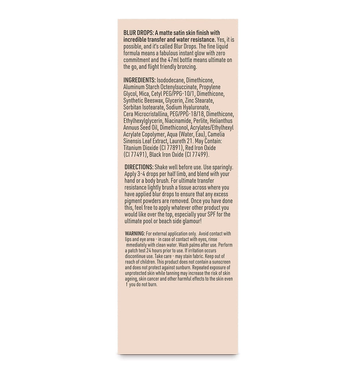 Schud de fles voor gebruik. Breng enkele druppels aan op een schone huid en blend gelijkmatig met de vingers of een spons. Begin met een kleine hoeveelheid, omdat het product zuinig in gebruik is. Verdeel het product in cirkelvormige bewegingen over de gebieden die je wilt bedekken. Laat het enkele minuten drogen voordat je kleding aantrekt. Het product kan zowel op het lichaam als in het gezicht worden gebruikt.