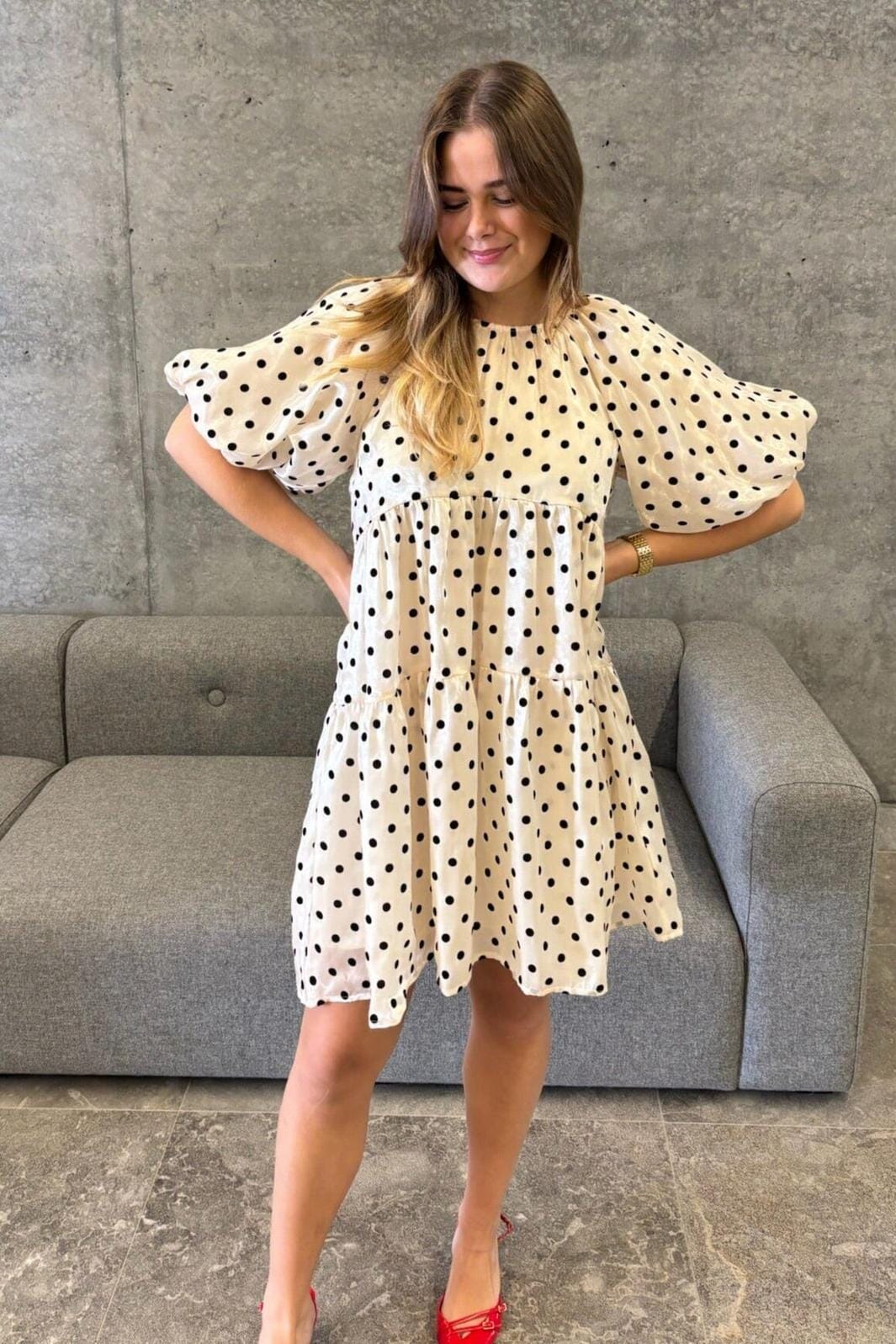 Beige jurk van Y. A.S met zwarte stippen. Het heeft een losse pasvorm met pofmouwen en een ronde hals. De jurk is knielang met ruches en bindbanden die een gelaagd ontwerp creëren.