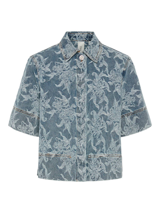Lichtblau denim shirt van Y. A.S met bloemenpatroon in kant. Het shirt heeft 2/4-mouwen, een overhemdkraag en sluit met knopen. Het is genaaid in regular fit.