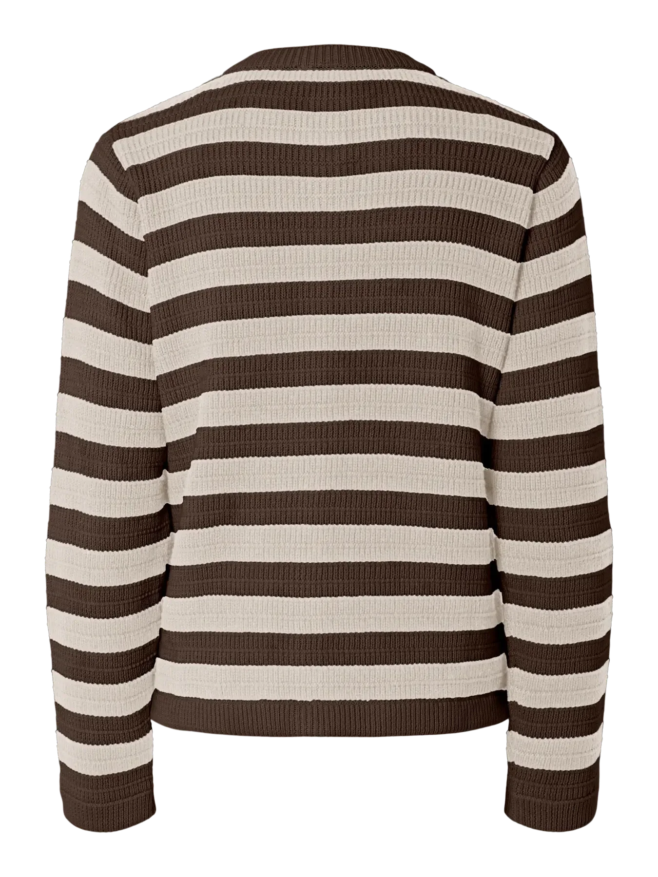 Gebreide cardigan van Y. A.S met horizontale strepen in chocoladebruin en beige. Hij heeft een ronde halslijn en gouden knopen aan de voorkant.