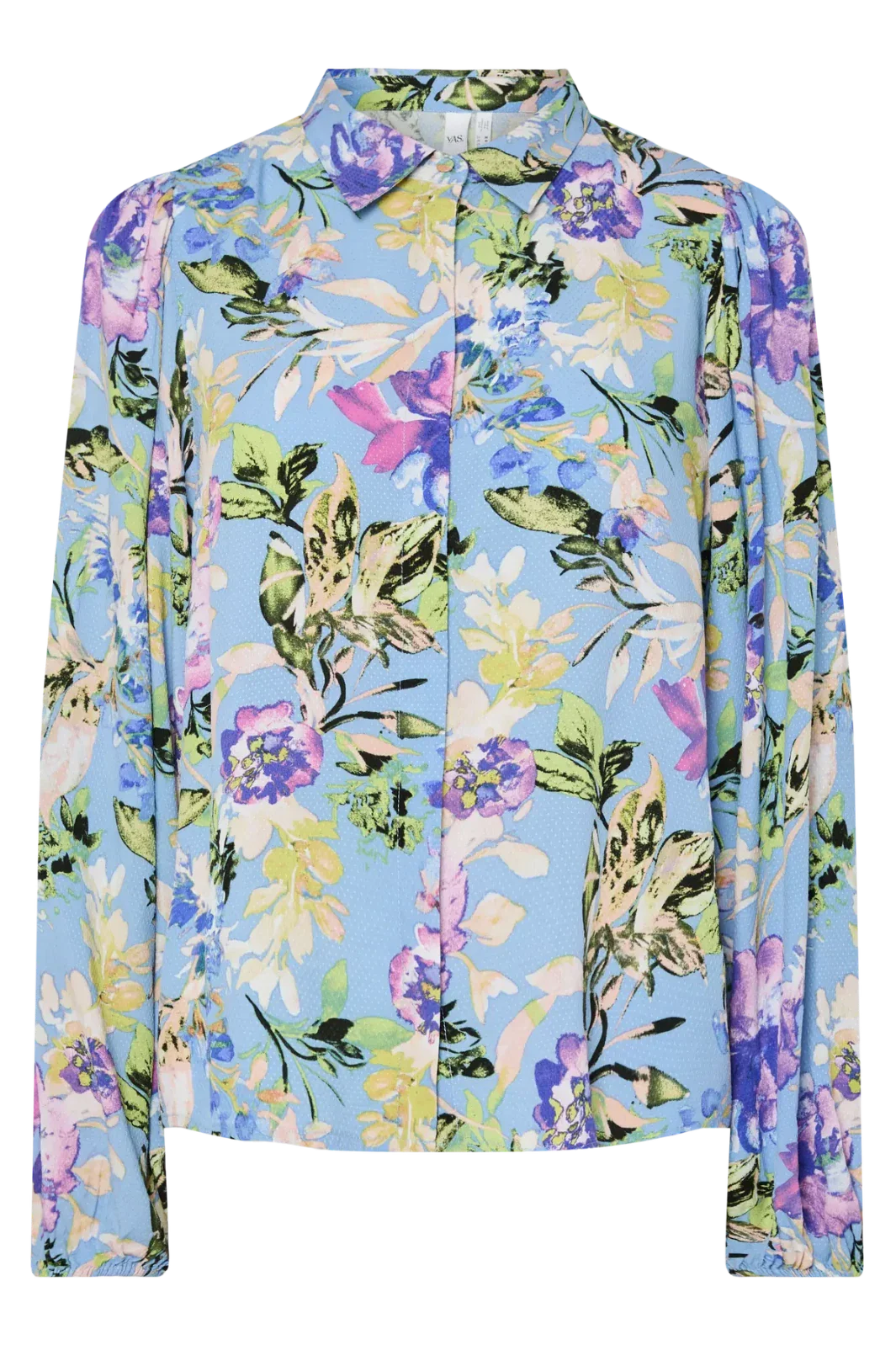 Overhemd van YAS, gemaakt van 100% Lenzing™ Ecovero™ viscose. De bloemenprint in paarse en lichtblauwe tinten bedekt het gehele oppervlak van het overhemd.