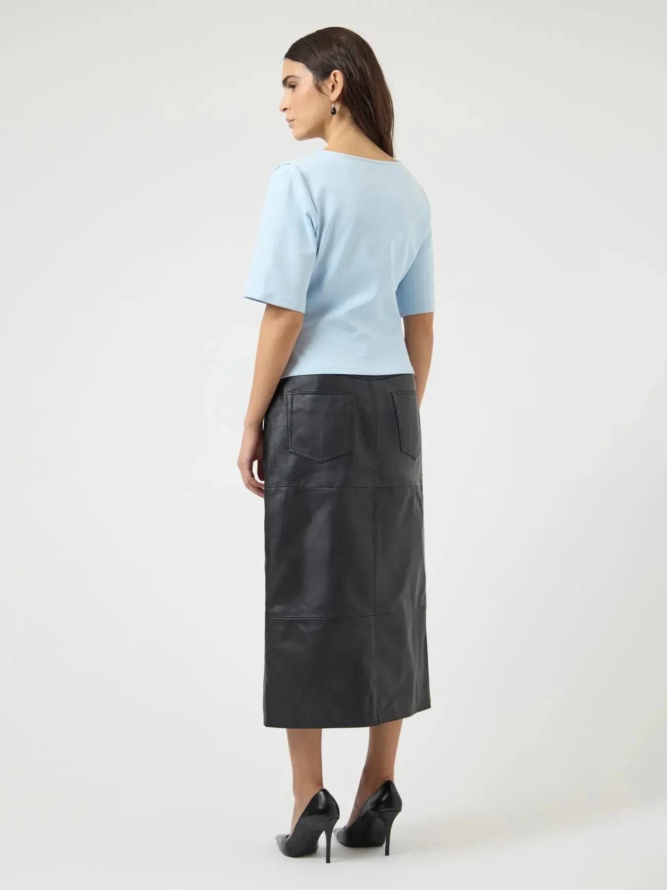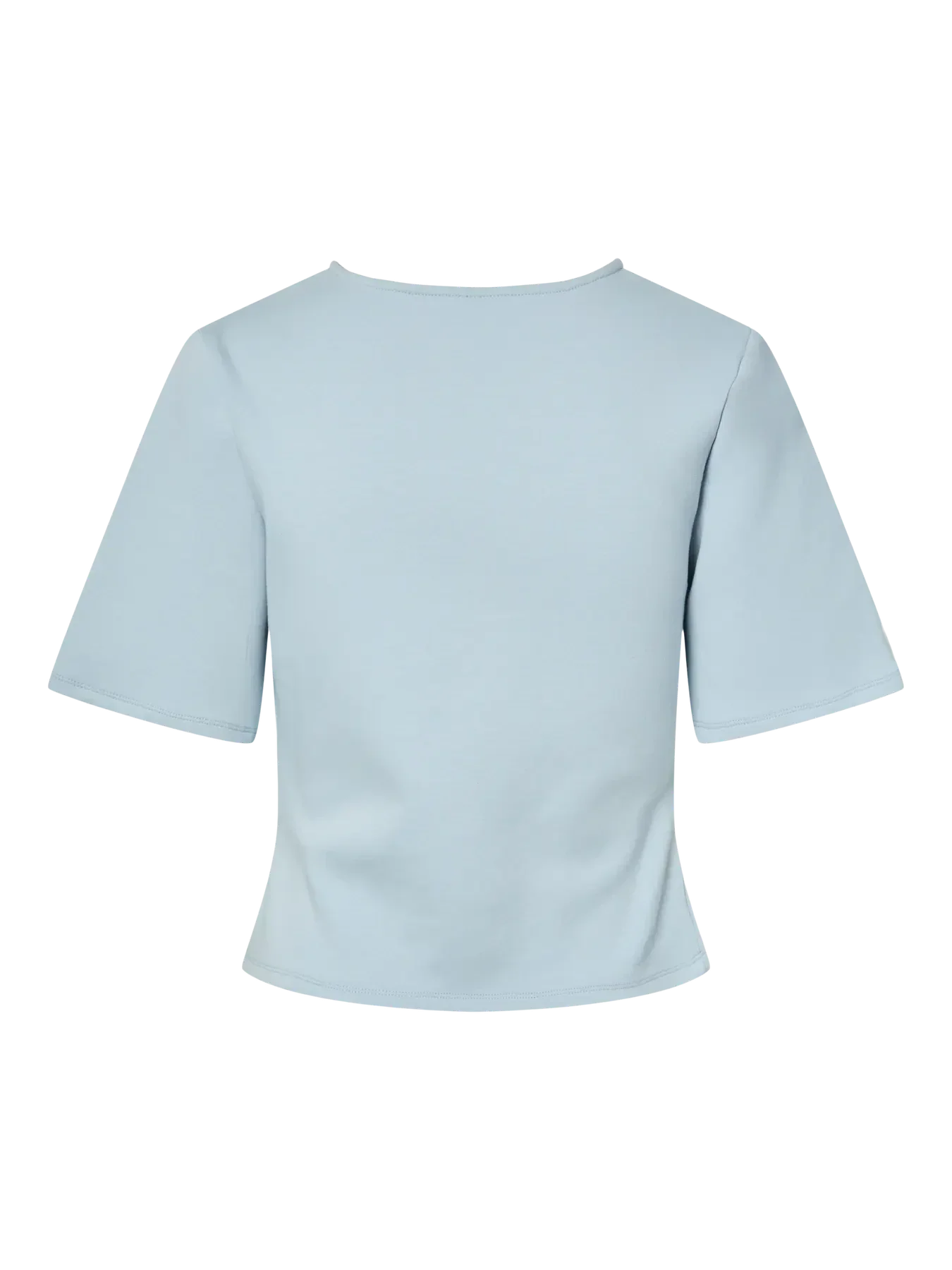 Een lichtblauw T-shirt van YAS gemaakt van jerseymateriaal met stretch. Het T-shirt heeft geplooide details bij de schouder en een asymmetrische zoom.