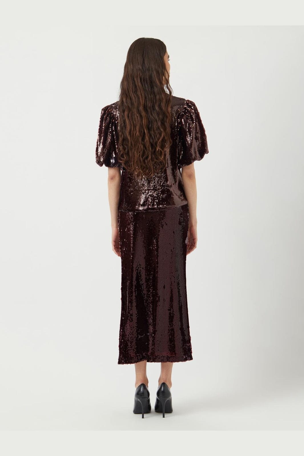 Enkellange rok van YAS, bedekt met pailletten in een diepe bordeauxkleur. De rok is gemaakt van 100% polyester.