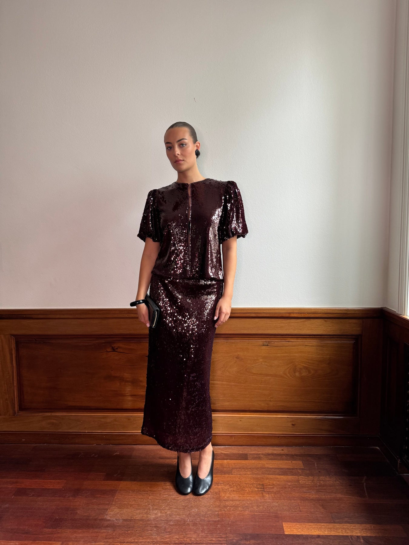 Enkellange rok van YAS, bedekt met pailletten in een diepe bordeauxkleur. De rok is gemaakt van 100% polyester.
