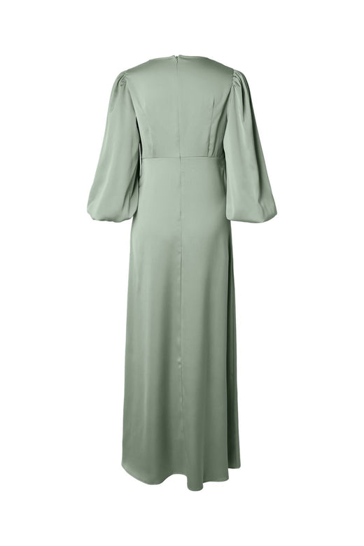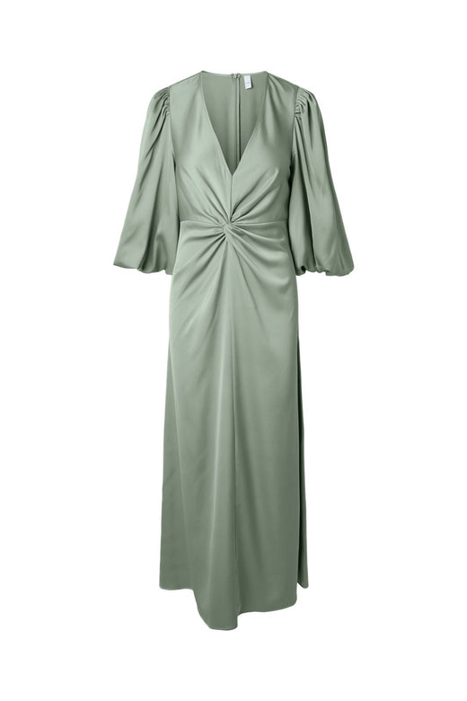 Lange groene jurk van YAS met 3/4-lange pofmouwen en een diepe V-hals. De jurk heeft een twistdesign in de taille en een regular fit-pasvorm.